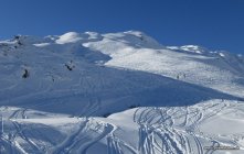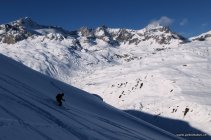 Abfahrt: Oben hat's noch wenige unverspurte Flächen. Im Mittelteil schon recht verfahren. Meist schöner pulveriger Schnee. Keine Steinkontakte. In den Büschen wenige Grundberührungen.