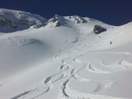 Sehr gute Verhältnisse. Leeseitig bester Pulver, also die Abfahrt nach Tschamut. Und da heute noch nur ca. 10-15 Personen unterwegs waren gibt es noch genug unberührte Hänge.