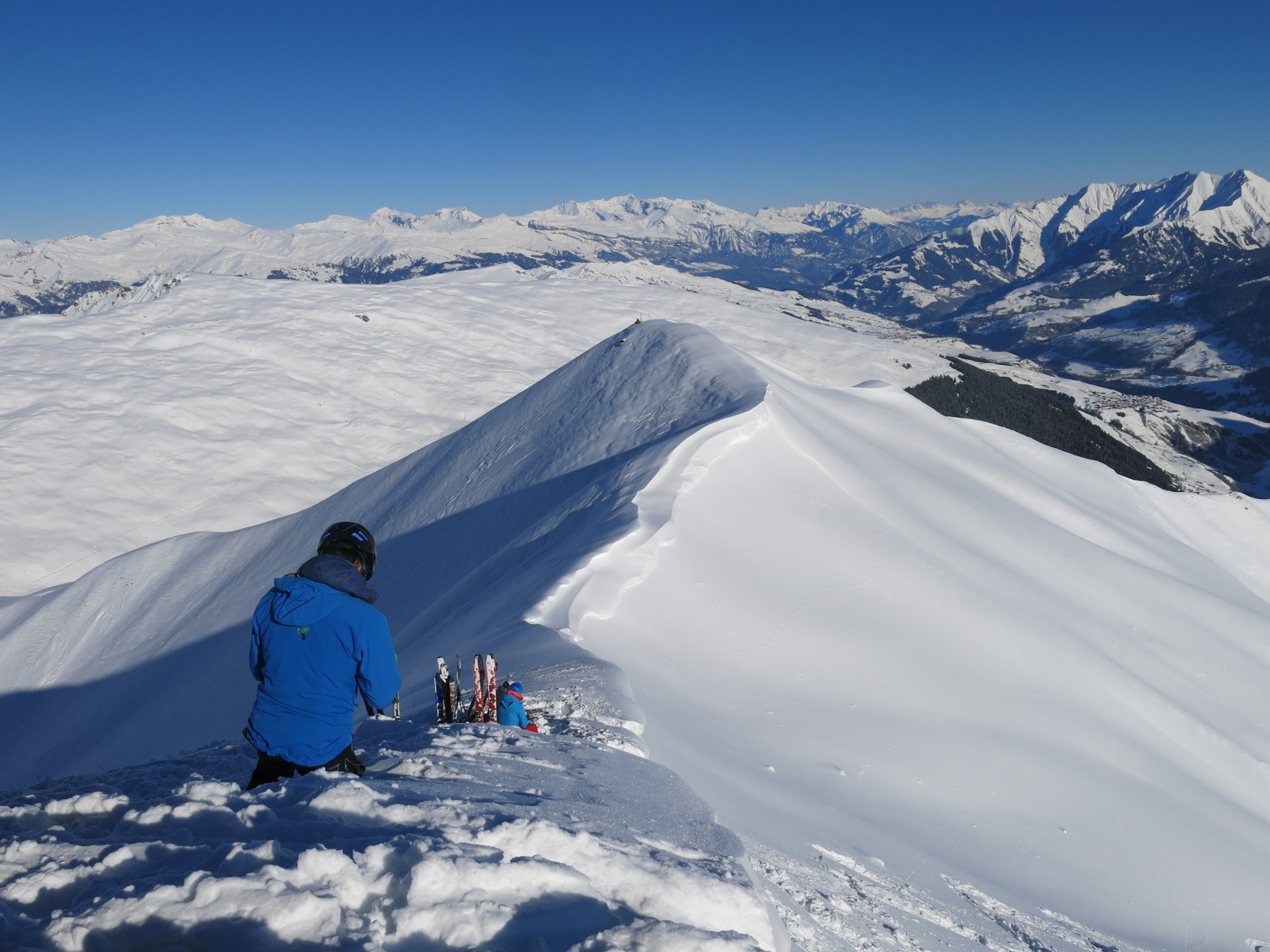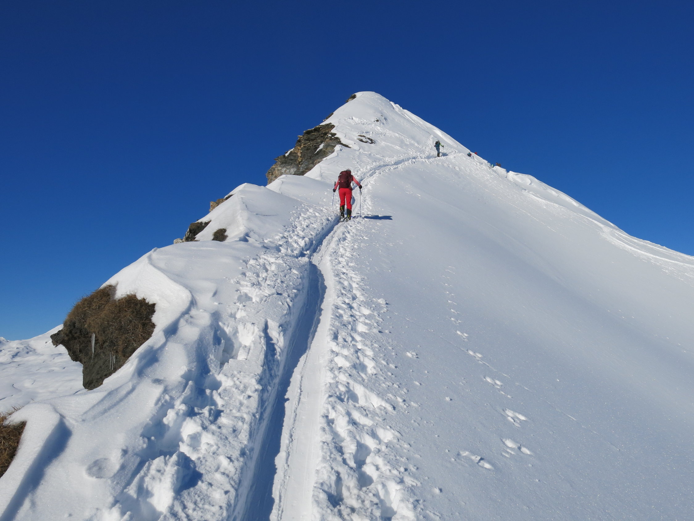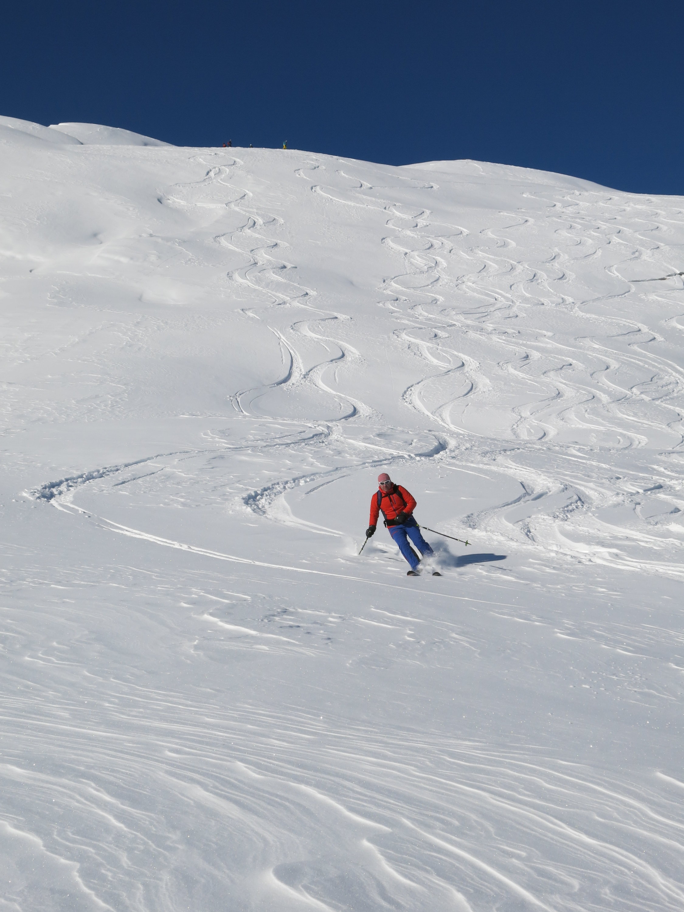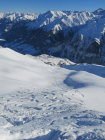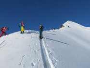 Im Aufstieg über Kuppen mit windgepresstem Schnee, in windgeschützten Lagen Pulver Schnee. Gleiche Verhältnisse in der Abfahrt zuzüglich kleine Passagen mit "Deckel" mehrheitlich jedoch Pulverschnee und unbefahrene Hänge.
