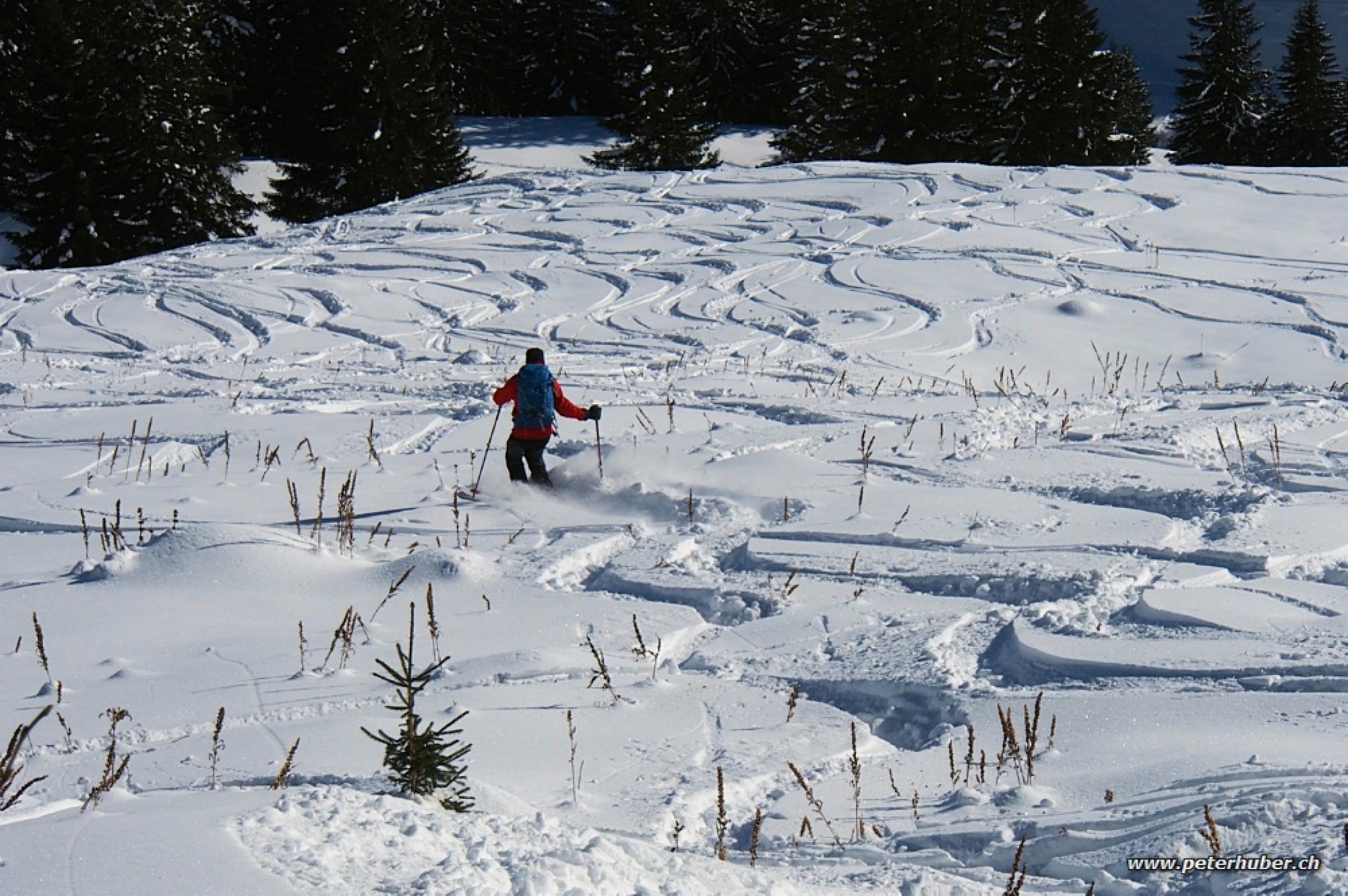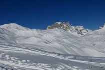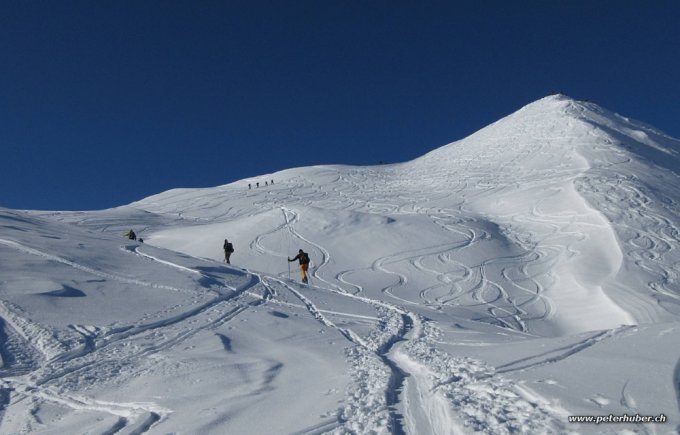 Abfahrt: Wer sucht, findet oben noch unverspurte Flächen. Sonst schon gut besucht und verspurt. Der pulverige Schnee ist trotzdem schön zu fahren. Im Waldstück wenig Grundkontakt.