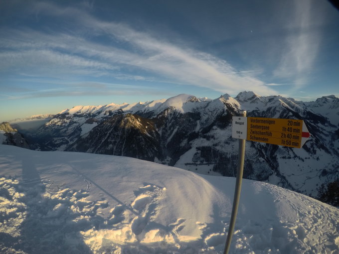 Ca s'annonce pas mal, la pente au dessus du parking du Mennigrund est plus enneigée que ce que je pensais. Temps froid, neige froide, super poudre. Il faut bien viser pour trouver un peu de profondeur mais globalement c'est parfait à skier. Quelques touchettes quand même dans la partie boisée.