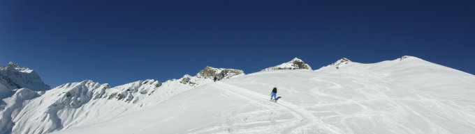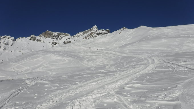 Die Route ist unter Skitourengänger sehr beliebt und unschwierig zu gehen. Vor mir waren etwa 50 Skitüerler unterwegs. Im Abstieg kamen mir noch mehr als 50 entgegen.