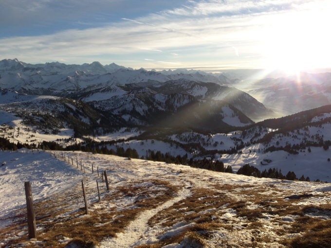 Im Wald viel Schnee, am Nachmittag schon zerfahren. Oberhalb der Waldgrenze teilweise abgeblasen, Vorischt teilweise Steine.