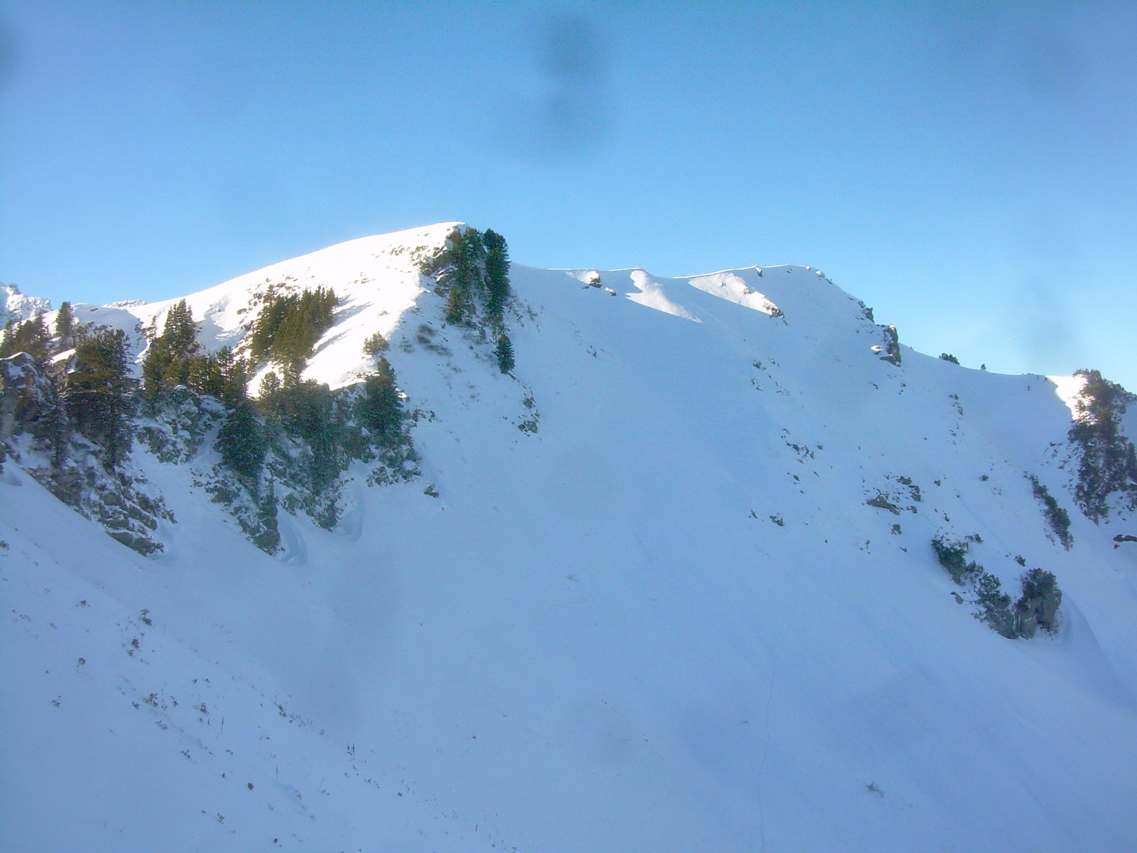 So mochte ich nicht recht glauben, dass der Schlußanstieg hinauf zum Kamm durch den Steilhang rechts der markanten Felsbarriere gehen soll und gehe den kürzeren und etwas weniger steilen Hang links der Felsen an. Dort oben wird´s dann eben ein Stück länger über den Kamm zum Gipfel, so dachte ich ...