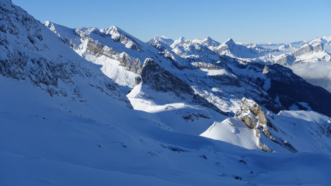 Etwa eine Stunde vor uns war schon eine andere Gruppe mit dem gleichen Ziel gestartet, deren Spuren wir folgen konnten. Der Spurer war aber wohl auch zum ersten Mal hier unterwegs, zumindest waren ein paar trickreiche Abfahrten eingebaut, die man normalerweise gut hätte vermeiden können. Im Anstieg in Richtung Chronenstock entschieden wir uns dafür, diesen tollen Hang später auch wieder abzufahren, auch wenn es dadurch ein paar Höhenmeter mehr geben sollte. Die Gruppe vor uns hat unterhalb der steilen Rinne Skidepot gemacht. Wir entschieden uns dazu, die Ski mit zum Gipfel zu nehmen. Aber so wirklich gelohnt hat es sich nicht, da die Strecke zum Gipfelkreuz überschaubar war. Aber ein paar Schwünge waren auch auf dem Gipfelplateau möglich. Um 12:15 waren wir am Gipfel.