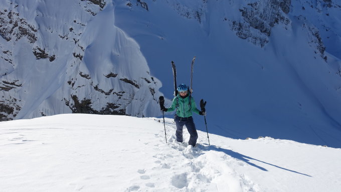 Bergab folgten ab dem (eigentlichen) Skidepot 200 wirklich tolle Abfahrtshöhenmeter. Es hatte etwa 30cm lockeren Pulverschnee auf einer ganz guten Unterlage.