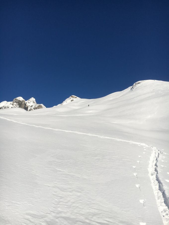 Besser als erwartet vorgefundene Verhältnisse. Bis Skihütte Erbs ca 10-15cm, mit der Höhe zunehmender Neuschnee, ca. 30-35cm. Die alten Spuren waren ab der Skihütte vollständig eingeschneit, herrlich. Obere 300m selber gespurt, vielen Dank Hansjörg für die ersten 3/4.