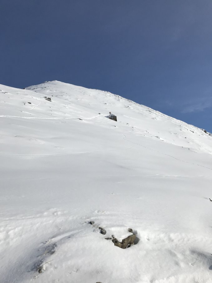 Start um 09:15 bei ca. -5.5C. Ca. 10cm Neuschnee auf zum Teil tragender Unterlage. Am Morgen auf den Gipfeln bereits deutliche Schneefahnen durch auffrischenden Südwind. Temperaturen in der Höhe zunehmend. Mit der Sonneneinstrahlung doch warm, so das der eine oder andere Schweisstropfen nicht vermieden werden konnte. Die letzten ca. 100hm optisch noch viele Steine sichtbar. Um die Skis zu schonen plus noch Grippegeschwächt waren das die Gründe für die vorzeitige Abfahrt. Abfahrt sehr toll. Die zum Teil einbrechende Unterlage störte in keiner Weise. Jedoch war die defekte Bindung (Fersenhalter schloss nicht..) etwas mühsam und musste dann unfreiwillig auf Telemark umstellen..:-)))
