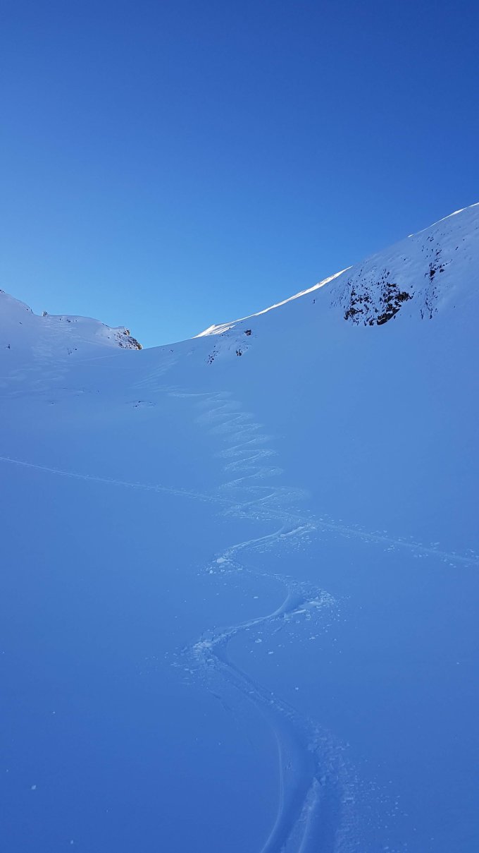 Ausreichend Schnee von unten ca. 15 cm, im Tälchen Richtung Fulfirst waren es super Verhältnisse; in den N und NO-Hängen sogar Pulver, siehe Bilder sehr schön.