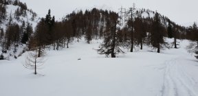 Start der Tour am 9.00 Uhr bei All`Acqua, die Temperatur mit +3° viel zuwarm, es hat über die Nacht wieder einiges an Neuschnee gegeben, so 20 - 40 cm, aber leider war er sehr pappig, der Wind wie auch die Sonne waren heute sehr devensiv, in der Oberen Hälfte sehr diffuses Licht, im Schlussteil dann viel besser.