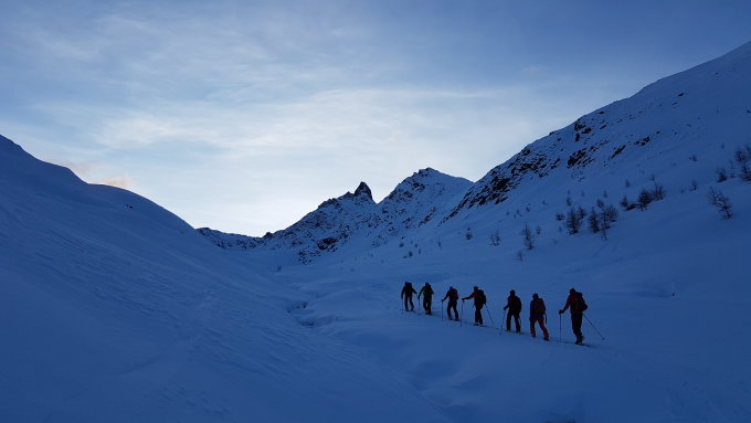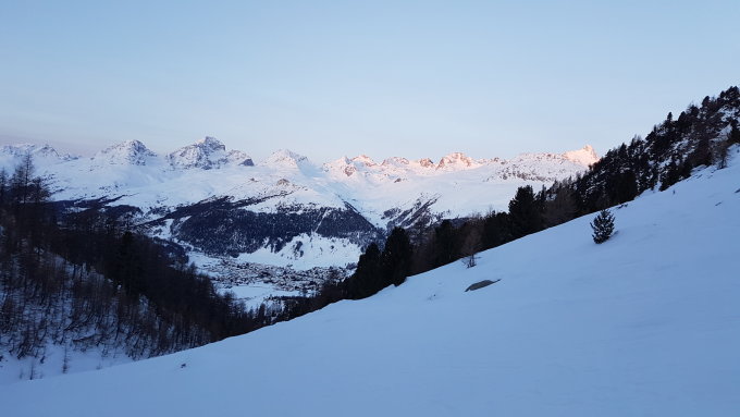 Morgens um 7 Uhr gestartet, da wir dem nahenden Sturm entgehen wollten. Unten auf dem Schlittelweg bis Tegia Muragl, danach der Route durchs Tal folgend. Skidepot wenig unter dem Gipfel.