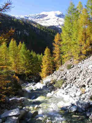 ab grossem Parkplatz Richtung Tracuit-Hütte. Alp Combutanna, Roc de la Vache, le Vicchiesso