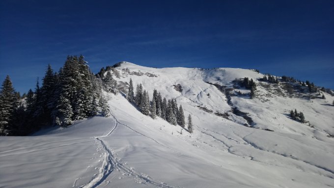 Kitschige Weihnachtstour. Oben 10cm Pulver auf Hartschnee, unten 10 - 20 cm Pulver auf 10 - 40 cm Altschnee, trotz wenig Schnee im Gebiet lohnende Tour