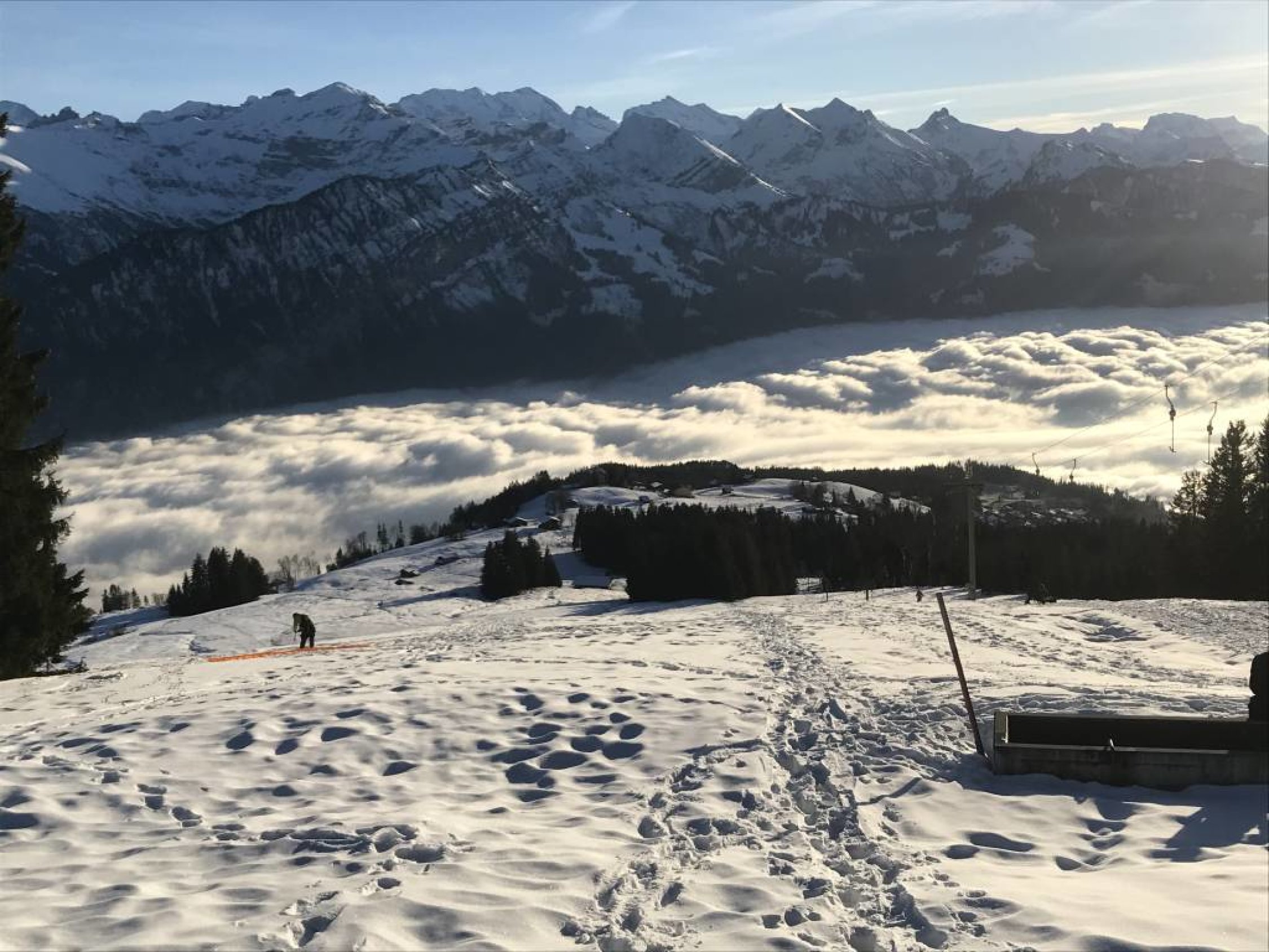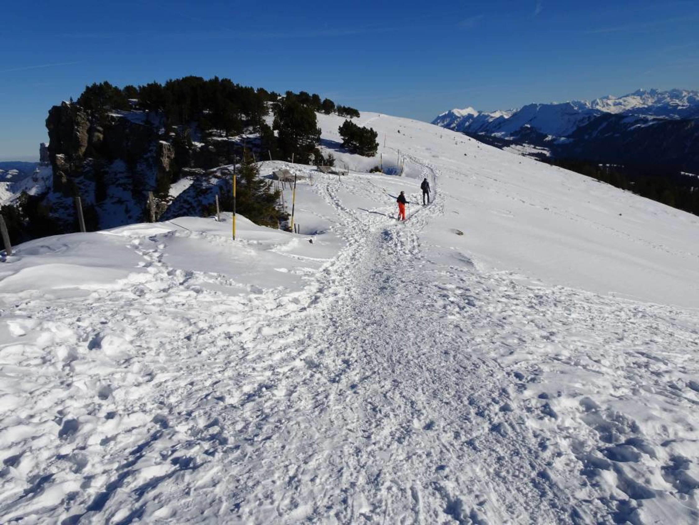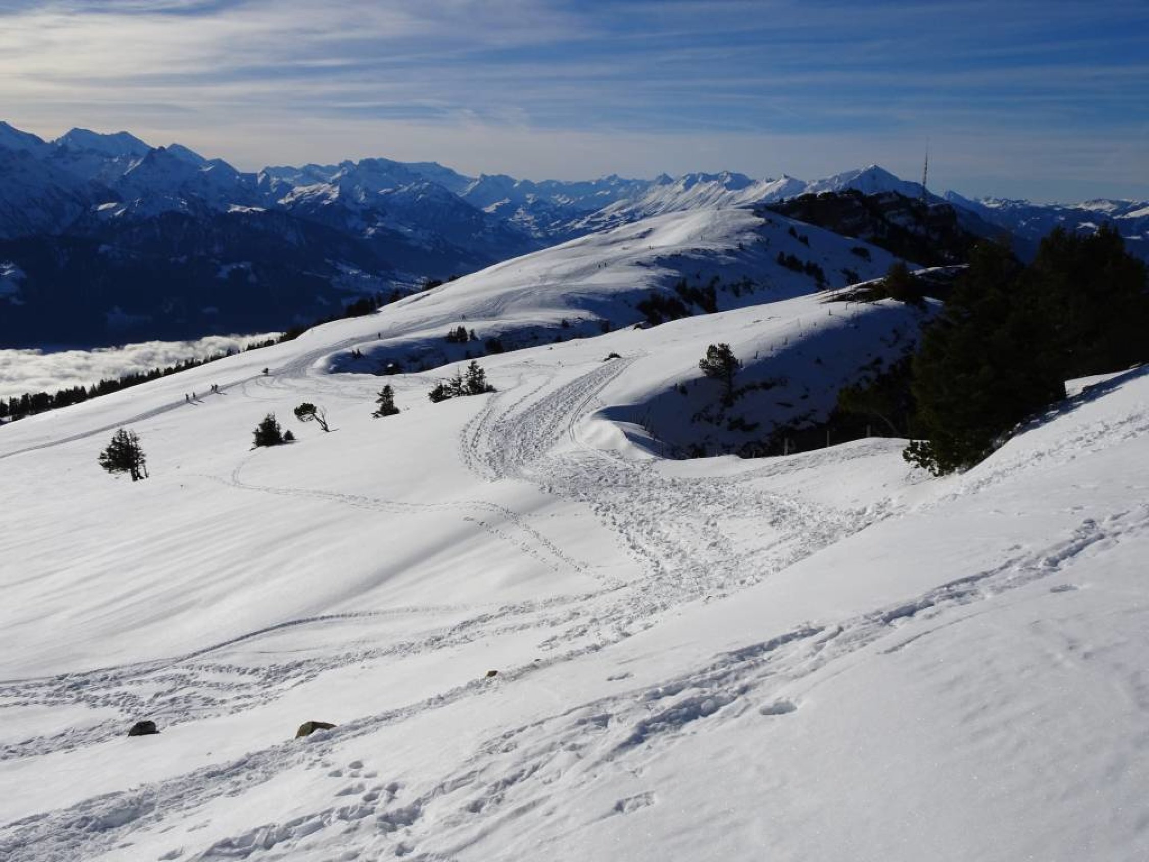 Zwischen Niederhorn und Burgfeldstand einige Fussgänger, ab Chüematte auch wieder mehr Fussgänger (Winterwanderweg). Dazwischen machbar ohne Schneeschuhe, jedoch bequemer und sicherer mit Schneeschuhe.