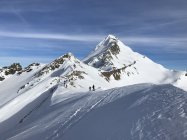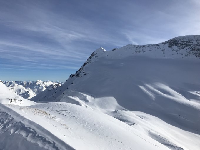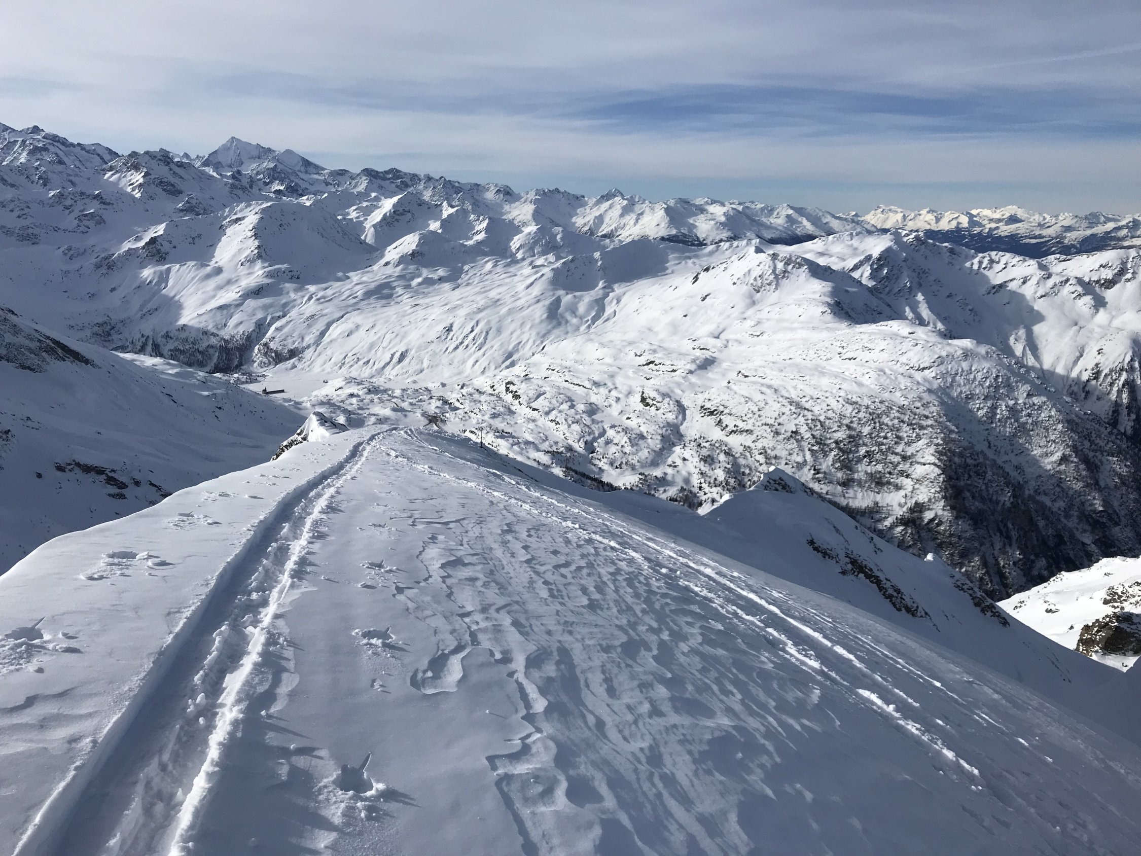 Sehr gute Verhältnisse und bis auf den letzten steilen Hang unter der Lücke schöner Pulverschnee. Um diese Zeit ist leider der ganze Aufstieg im Schatten. Alle Vorgänger sind im Aufstieg auf den Westgrat des Mäderhorn gequert und dann mühsam (so hat es auf jeden Fall beim Zuschauen den Eindruck!)über den Grat aufgestiegen. Dieser ist zum Teil noch recht ausgesetzt und man muss ein oder zwei Mal die Skier abziehen. Ich bin dann als erster in zwei drei grossen Kehren den Schlusshang direkt mit Skier aufgestiegen. Es gibt da ein paar sehr eisig gefrorene Stellen, aber mit den Harsteisen und nachdem hinter mir doch ein Paar in der gleichen Spur aufgestiegen sind, ist die Normalroute auf die Mäderlicke gut machbar.