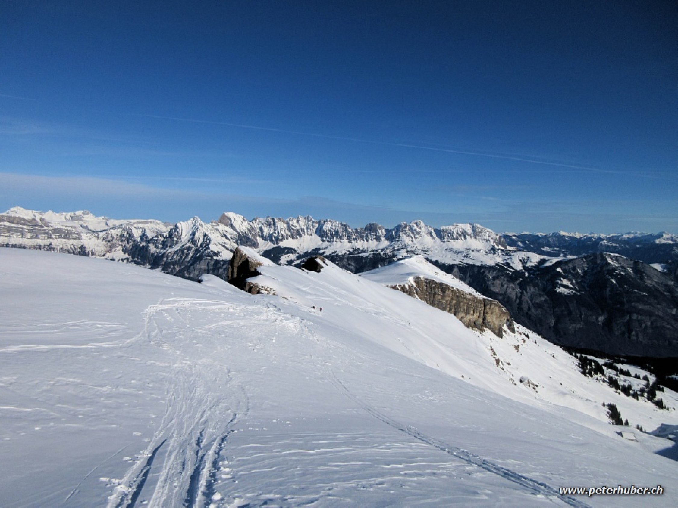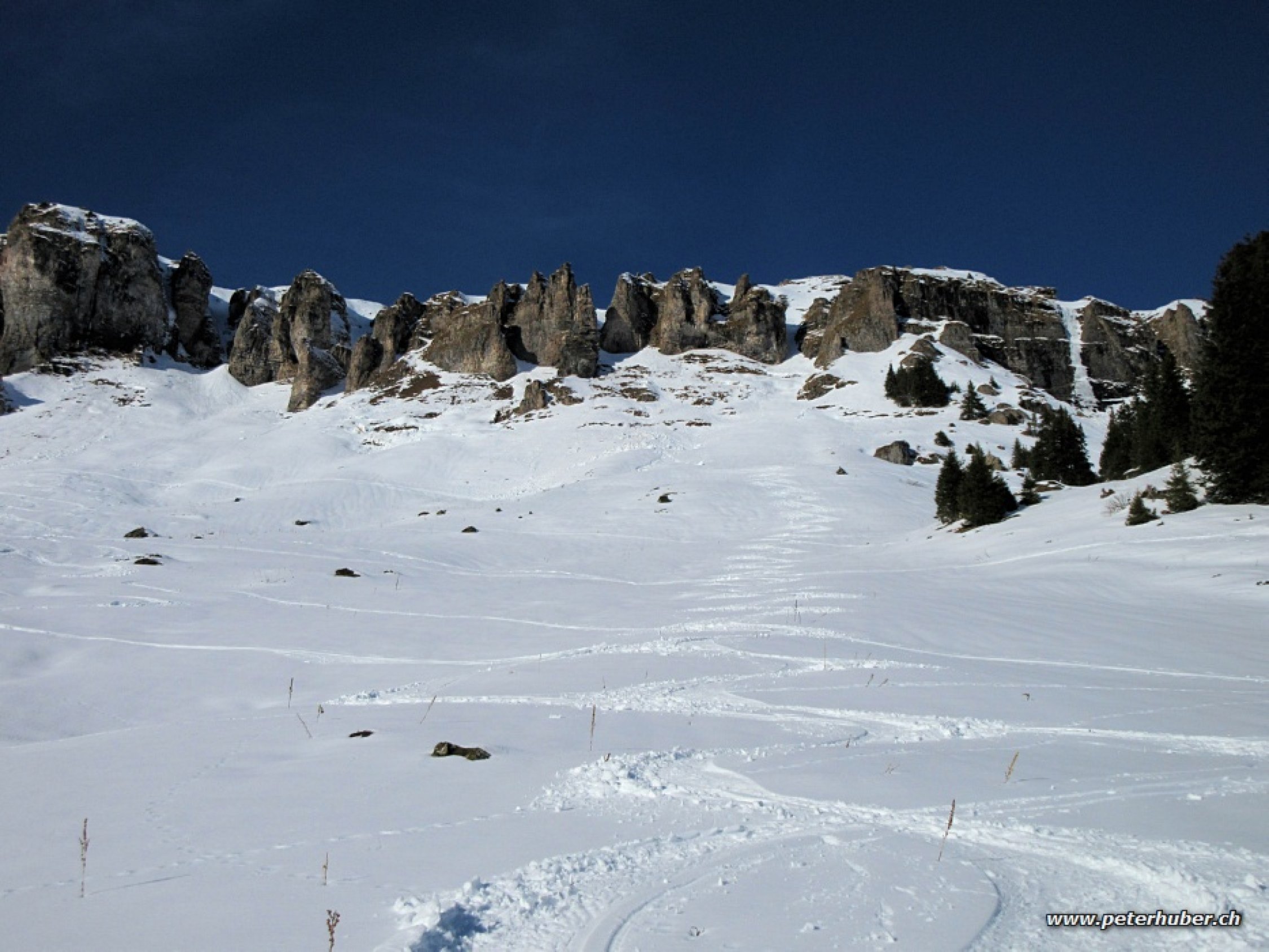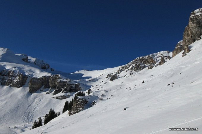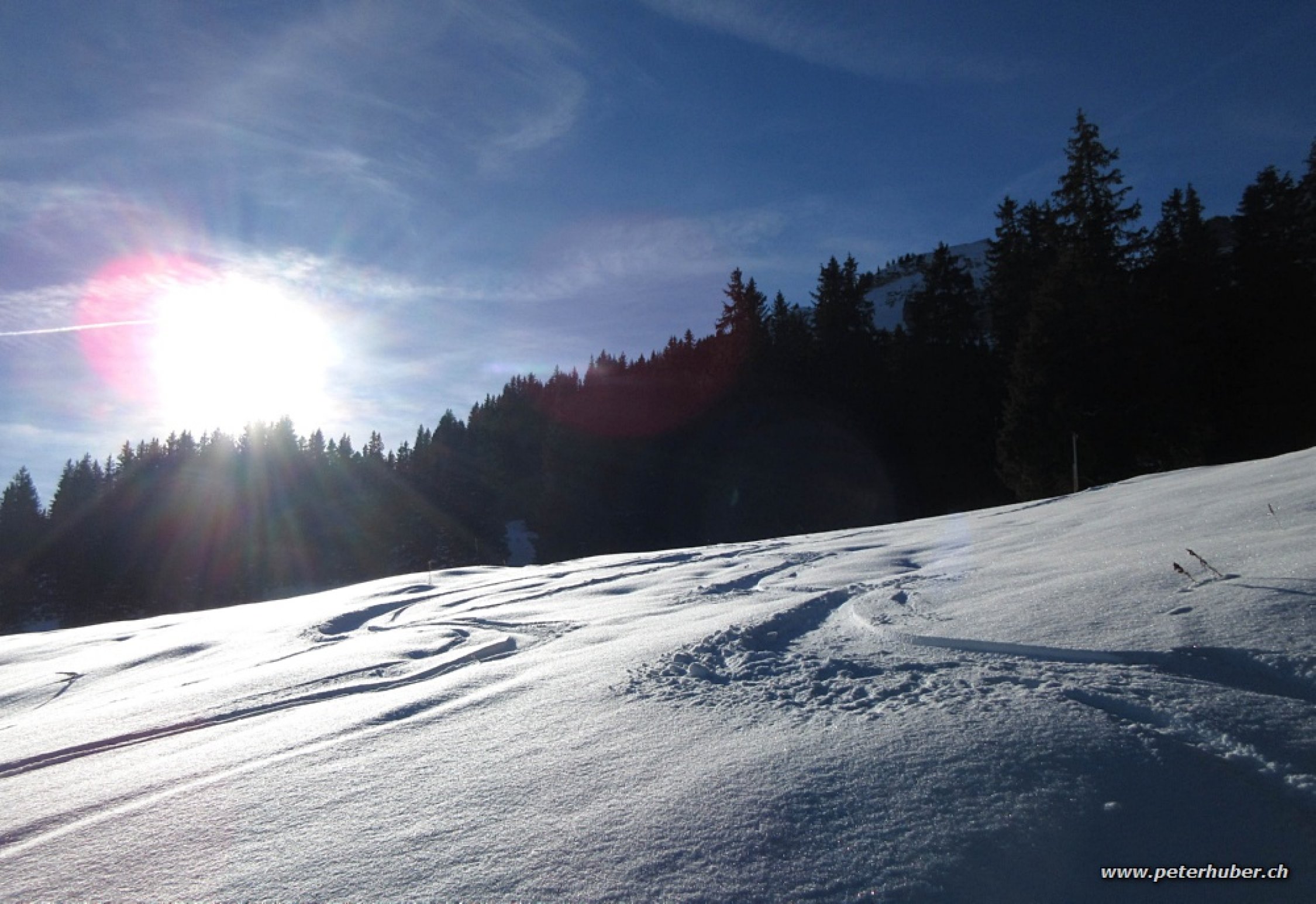 Abfahrt: Oben in den Sonnenhänge ca. 5 cm lockerer Feuchtschnee auf gut tragender Unterlage, gut zu fahren. Im Flachen schöner Pulverschnee. Da hat die Sonne noch nicht so gewirkt.