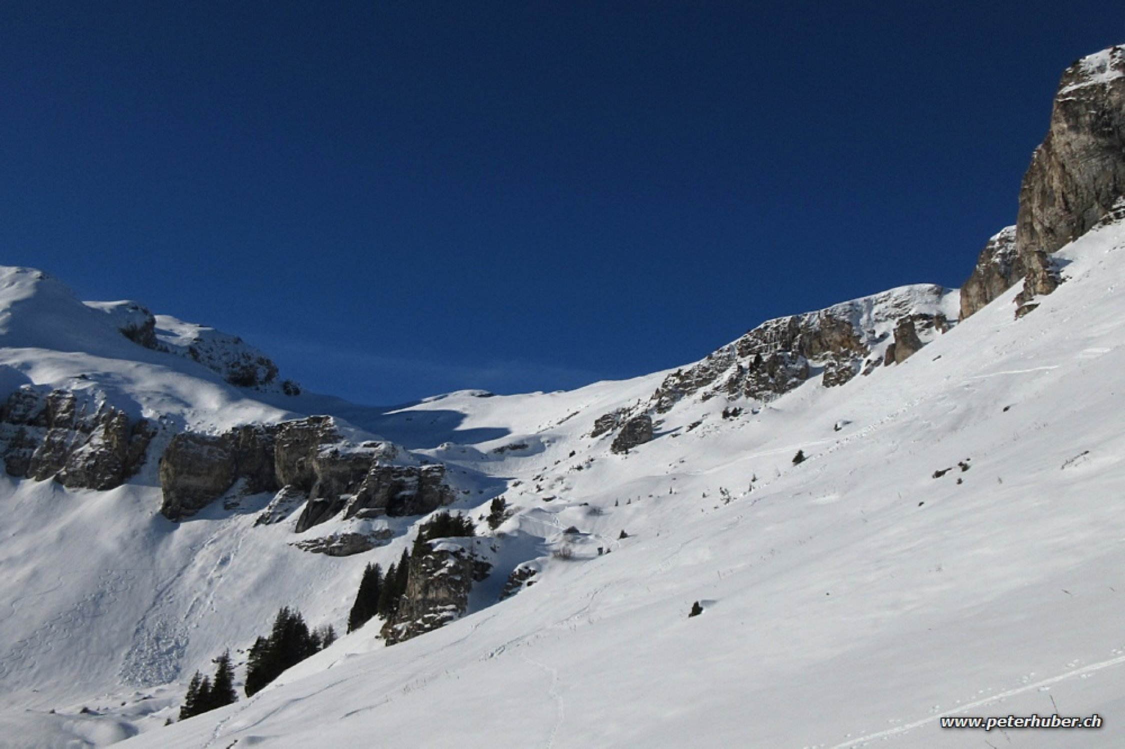 Strahlend schöner Tag. Ab dem Berghaus hat es genügend Schnee mit einer gut tragenden Unterlage. In der Sonne recht warn. In der Querung sind etliche ältere und neuere Rutsche abgegangen. Ganz am Schluss ist es eisig und hart und kurz mühsam sich hochzukämpfen.