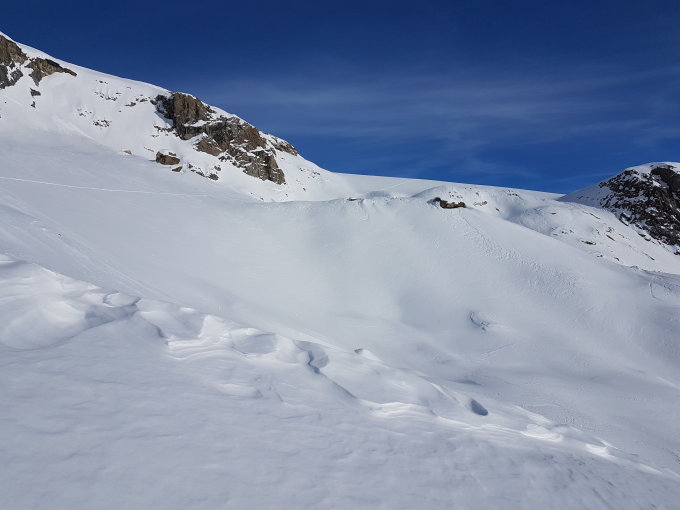 Die Abfahrt war bei uns nicht so toll wie bei Tinu Richtung Blatten. Bis 2800 MüM auf Presspulver gut, danach ein Mix von Presspulver, Bruchharsch, eisig und Pulver. Das ganze war wegen der Verwehungen fast "unlesbar" und konnte daher nur selten in einen Rhythmus gezwungen werden. Deshalb sind wir runtergefahren statt gewedelt :-)