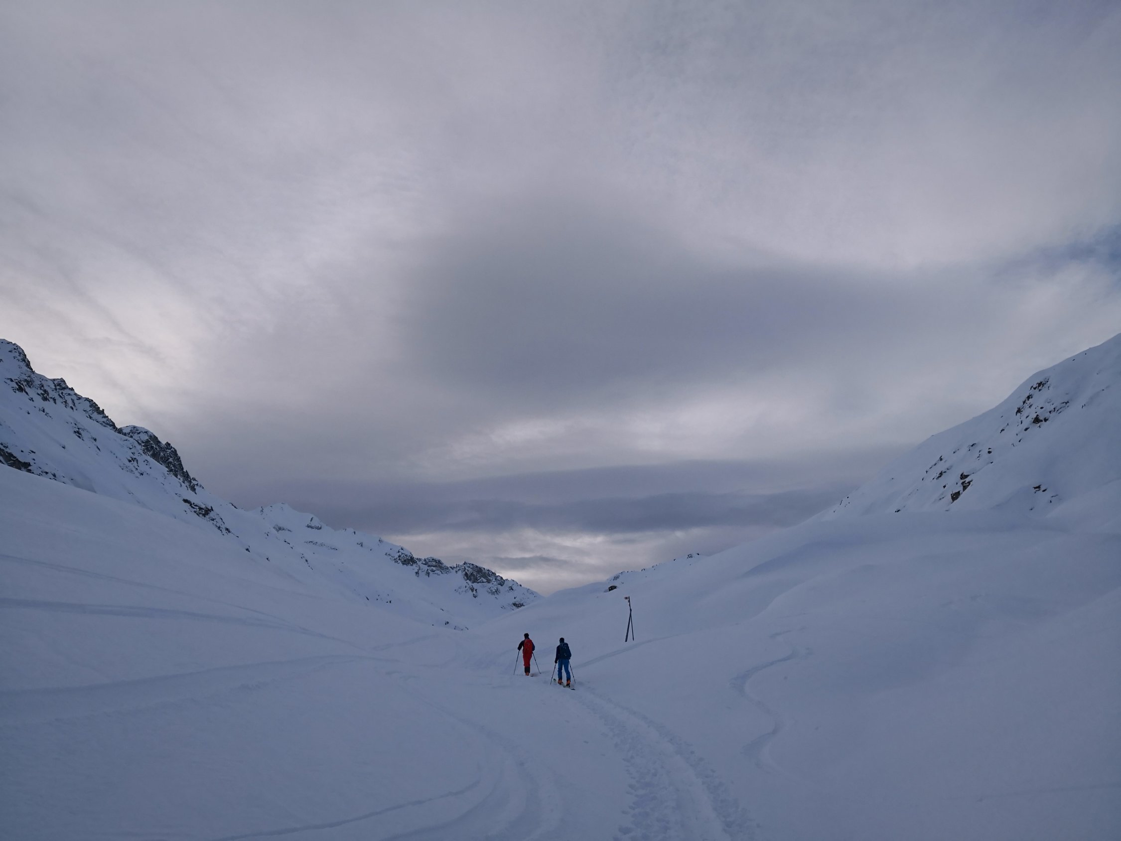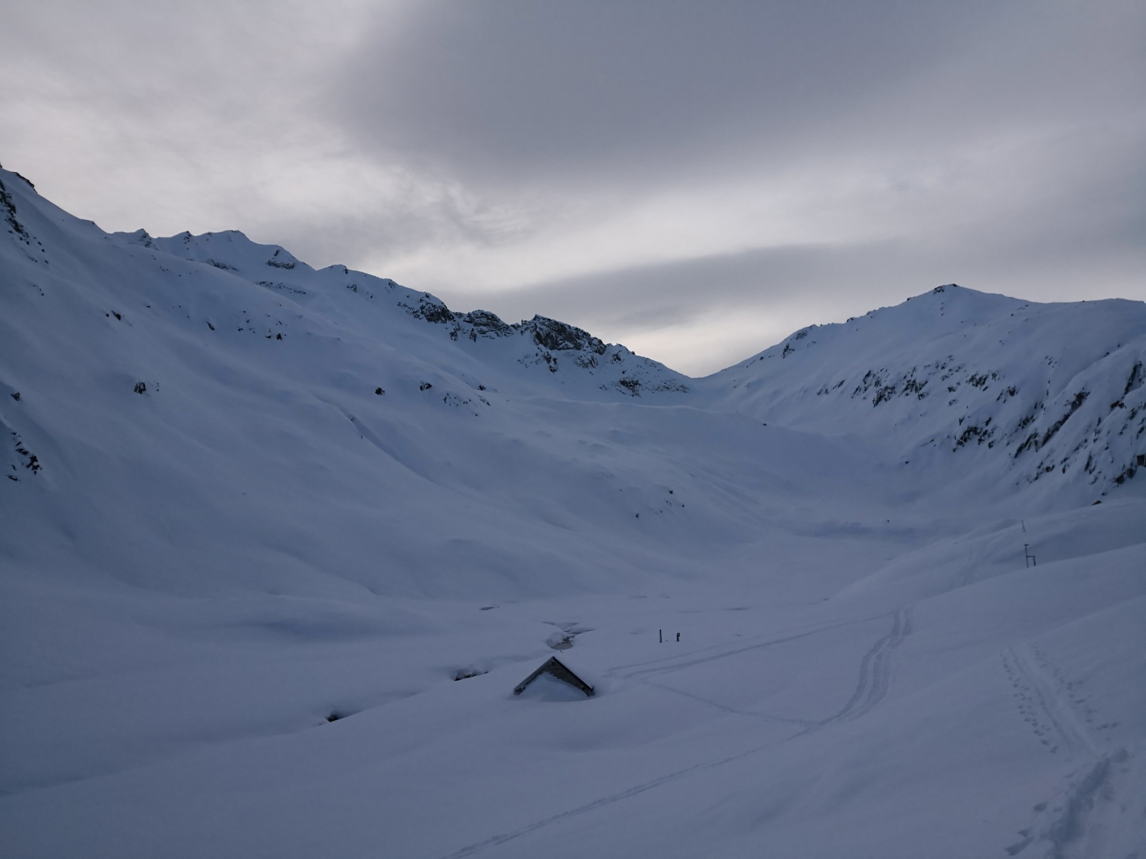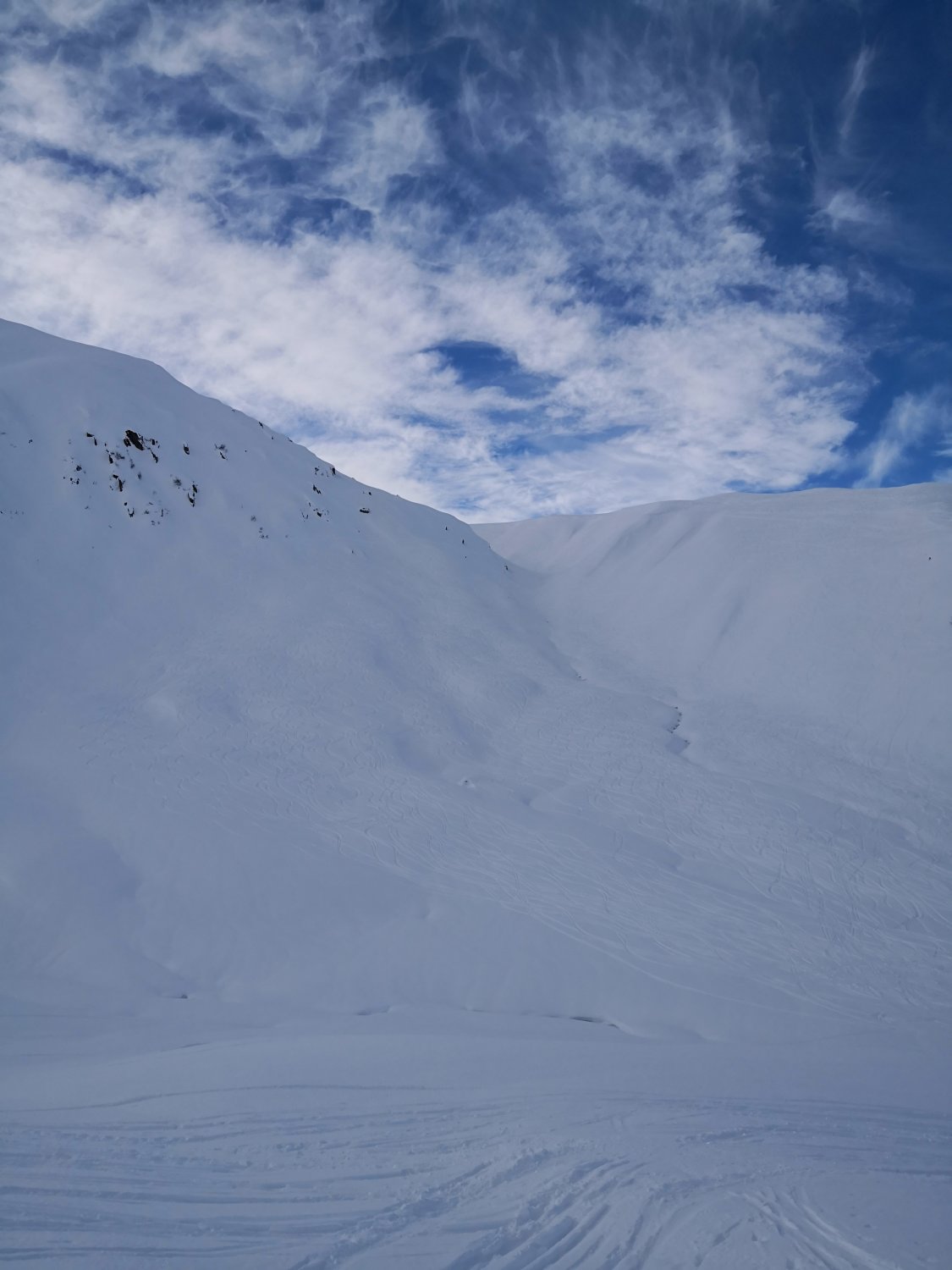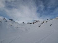 Schnee hats genug ab ca. 2000m, darunter der Strasse entlang wenig Schnee aber ausreichend um bis zum Depot fahren zu können. Recht wenig Leute unterwegs..Richtung Leckipass- Gr.Leckihorn max. 10P. Rottällihorn mit mit insgesamt nur 4P. Das wird morgen Sa sicher anders aussehen...