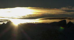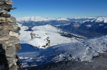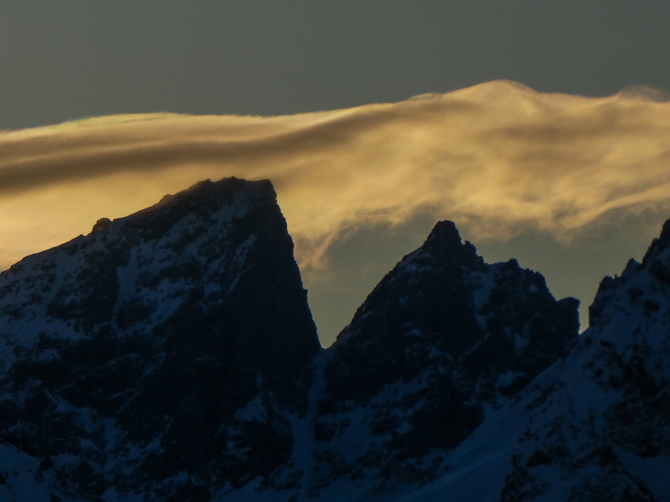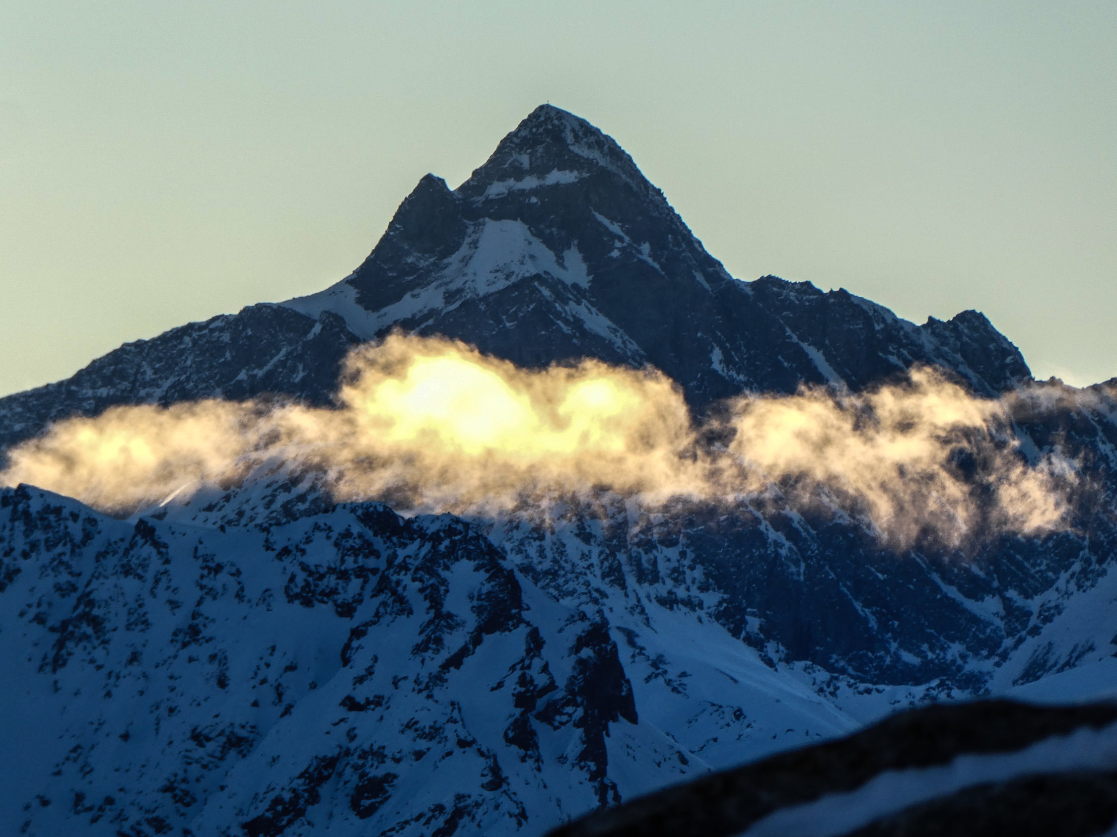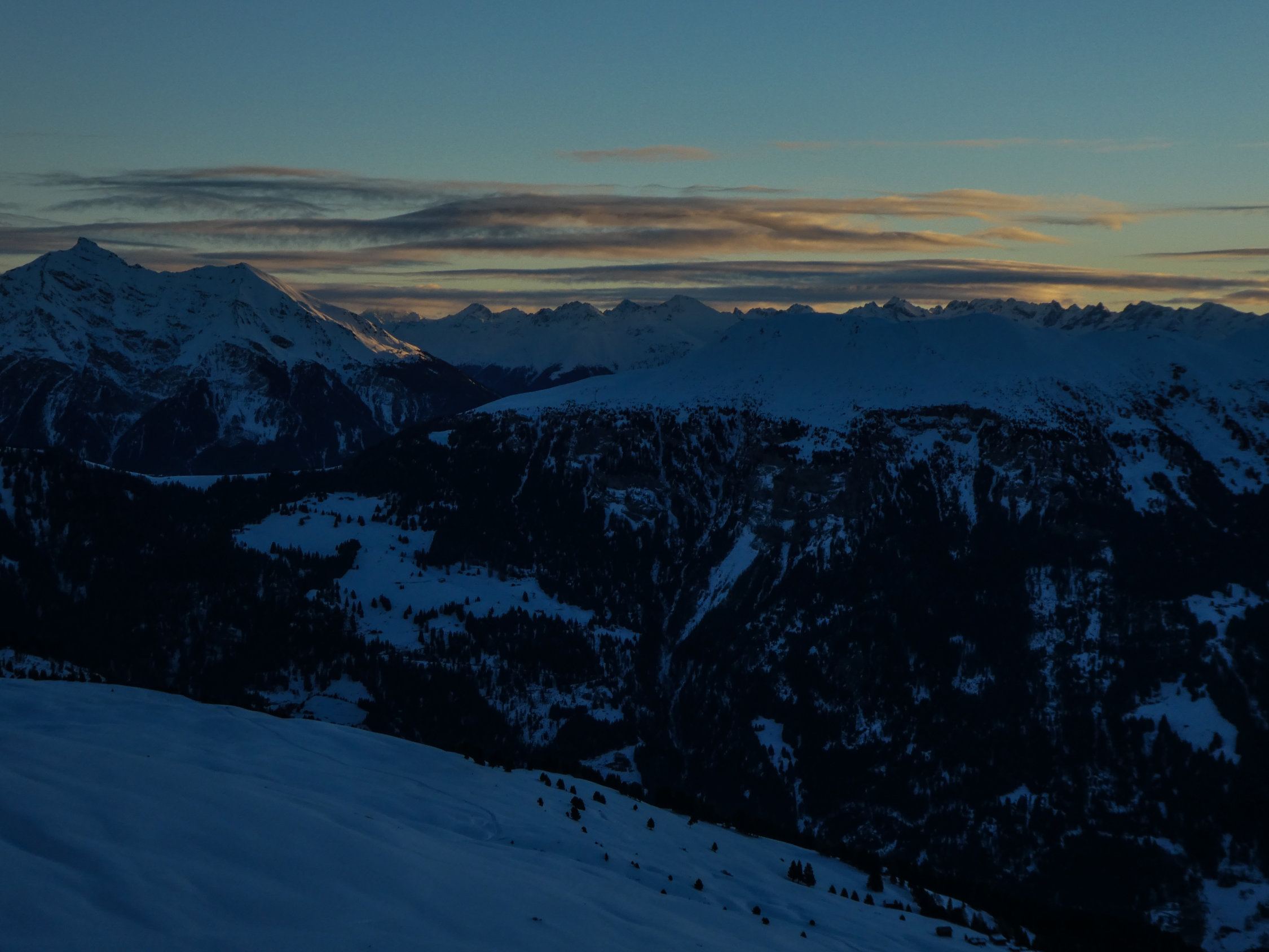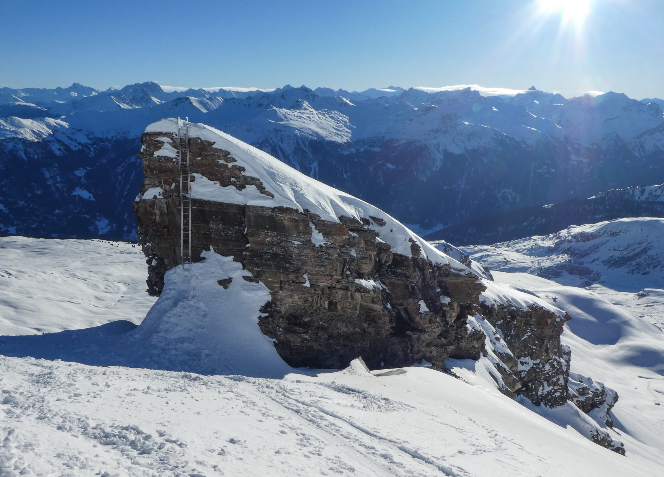 Prachtstag nach schwefligem Sonnenaufgang. Auf dem Gipfel wehte eine eisige Bise. Ich habe es noch selten erlebt, dass die Geröllhalden oberhalb der Leiter so fett eingeschneit waren. Heute gab es absolut keinen Steinkontakt, und das hat eher Seltenheitswert am Piz Beverin...