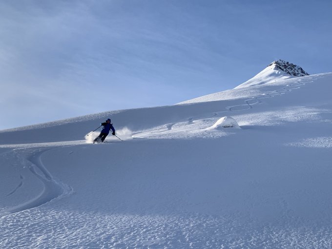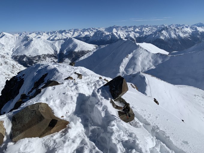 Sehr gut eingeschneit, Trittschnee am Gipfel. Mit Wind kalt, aber super Aussicht. Abfahrt teils Pulver, teils windharst.