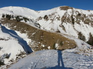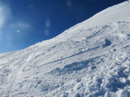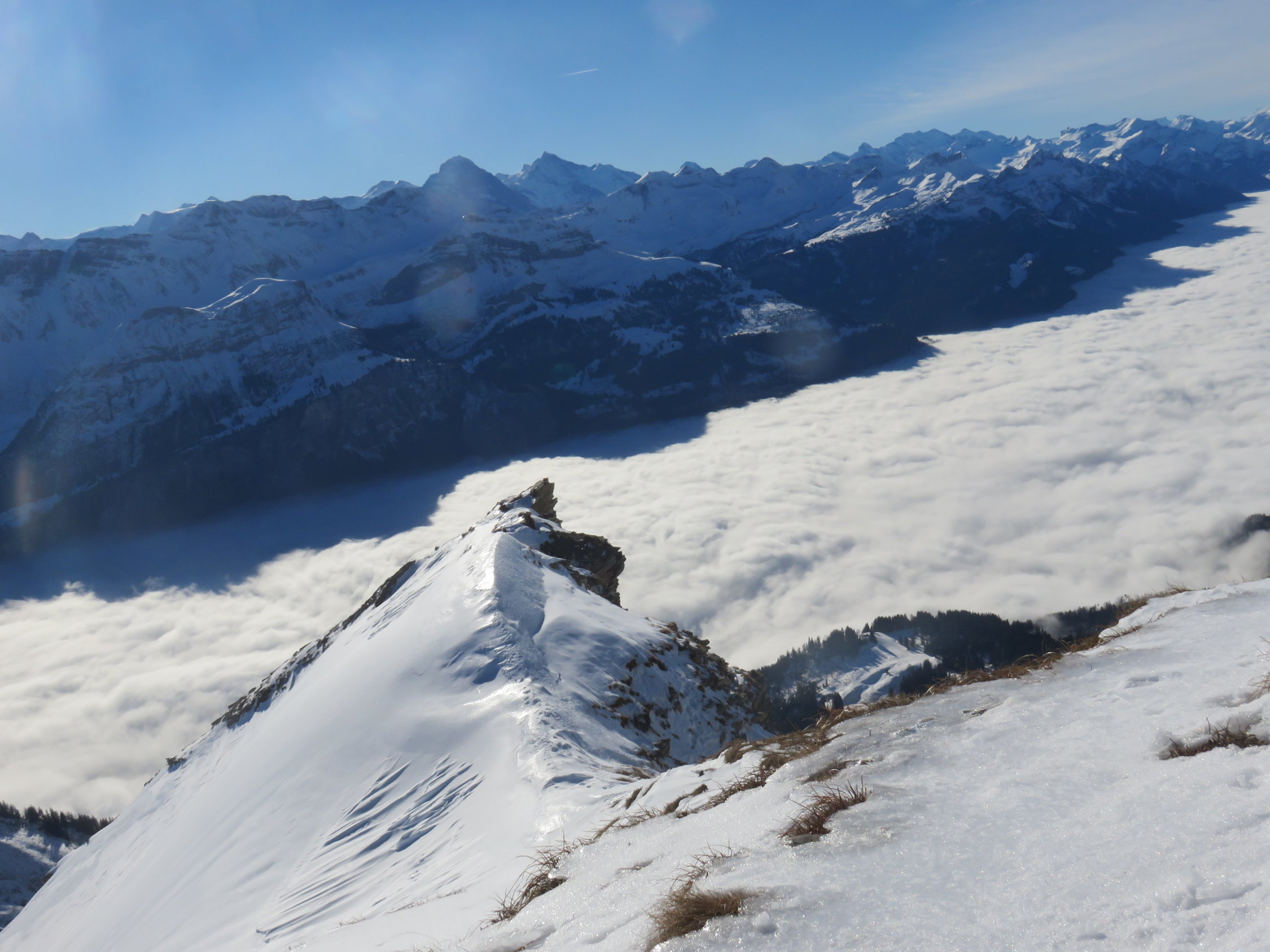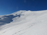 Stellenweise wenig Schnee, aber keine Steine. Gut machbar. Ziemlich stark zerfahren aber dennoch gut fahrbar. Im Hang vom Gipfelbereich etwas eisig. Harscheisen sind komfortabel.