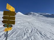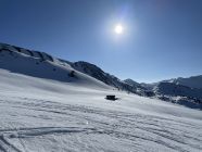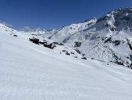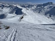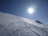 Tourenbeginn um 07:15 Uhr bei 0°C und leichtem Zug, der bald aufhörte. Morgens war der Hartfirn noch tragend, so dass der Aufstieg kraftschonend gelang. Ski- und Ss-Spuren waren zur Genüge vorhanden. Im Abstieg hatte die Sonne die Firnauflage weich gemacht, so dass die Knie nicht zu stark strapaziert wurden.