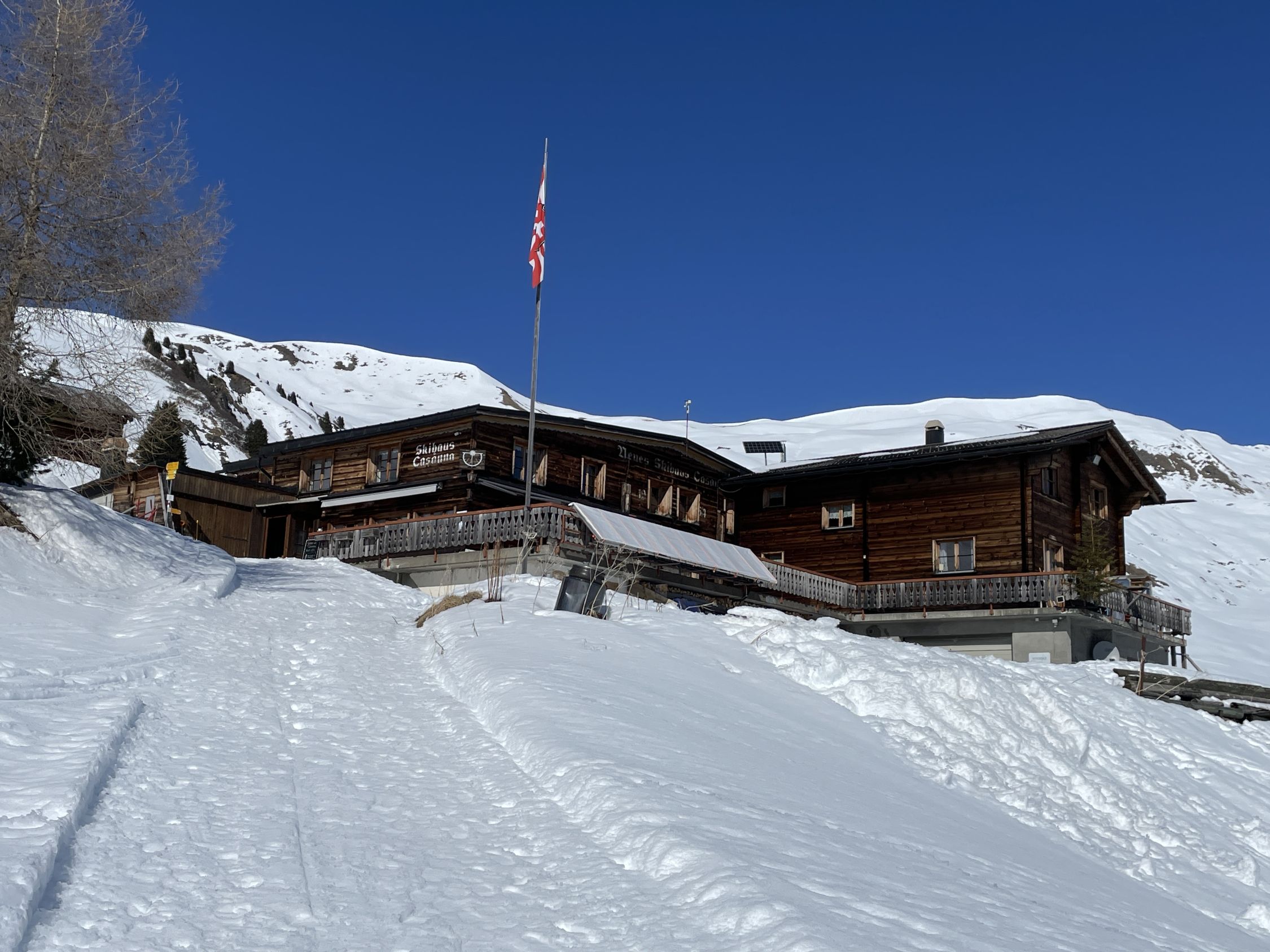 Skihaus Pirigen hatte geschlossen. Pension und Restaurant Neues Skihaus Casanna hat noch bis 21.3. geöffnet von 10:00 bis 22:00 Uhr, freitags bis dienstags.