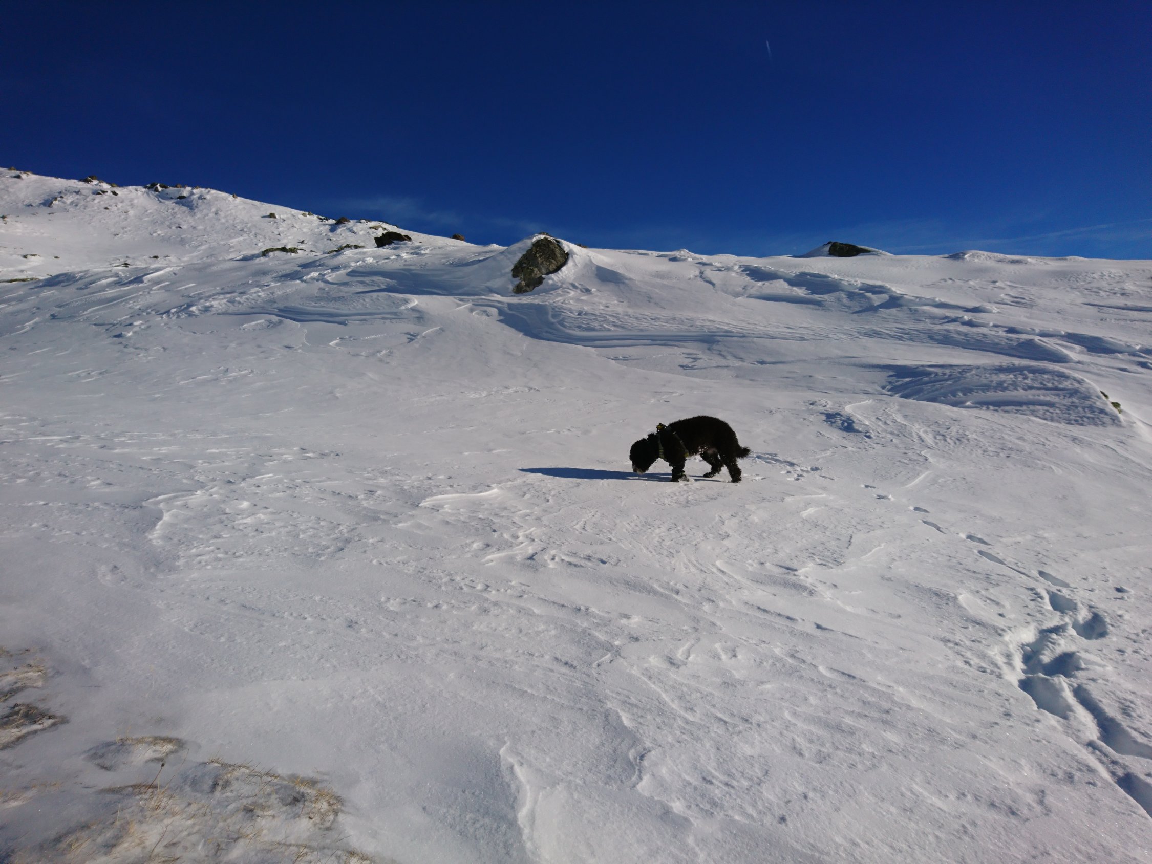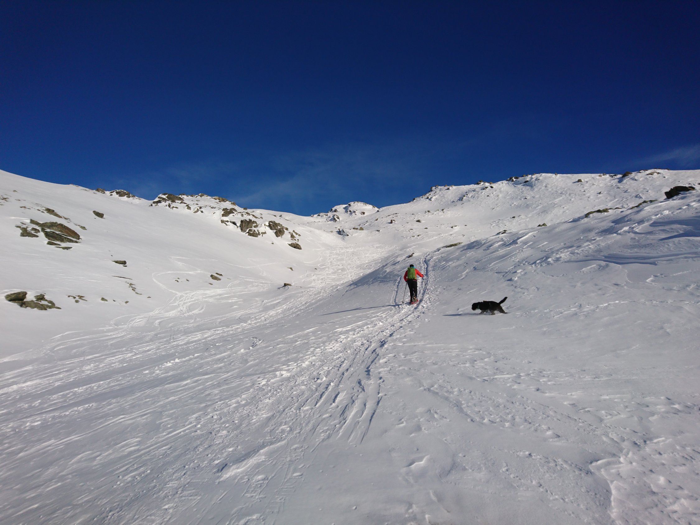 Bis ca. 2200m tendenziell nasser Schnee, Oberfläche angetaut und nachts wieder gefroren. Danach fast geschlossene Schneedecke mit einzelnen, vom Wind abgeblasenen, aperen Stellen. Triebschnee v.a.in Mulden - zeitweise mässiger N-/NW-Wind.