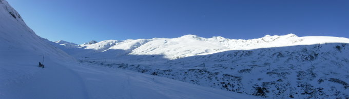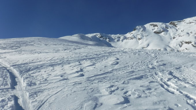 Tourenbeginn um 09:30 Uhr bei -4°C unter wolkenlosem Himmel. Stellenweise kalter Nordwind. Im unteren Bereich verfügt der Schnee über einen Deckel, der jedoch nicht trägt. Im Osthang befinden sich abgeblasene und windverfrachtete Bereiche. In letzteren herrscht noch Pulverform vor. Im oberen Bereich unterhalb des Südgipfels gibt es verharrschte Verhältnisse. Es fehlt Schnee, stellenweise schaut Fels, oder Gras durch. Den Grat konnte man problemlos passieren, dank der guten Spur.