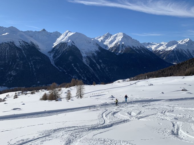 Der wenige Neuschnee bescherte perfekte Verhältnisse: Pulverschnee auf der ganzen Route. Ab der Cabanna Cler musste gespurt werden. Wir sind auf dem vorgipfel umgekehrt, aber eine ältere Spur führt zum hauptgipfel.