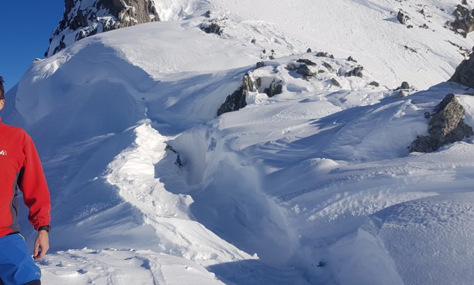Vorsicht am Passo Gararesc. Beste Beschreibung ist wohl "Wechtenspalte". Der Kollege ist bis zum Füdli eingebrochen, und das Loch könnte evtl. noch deutlich tiefer sein.