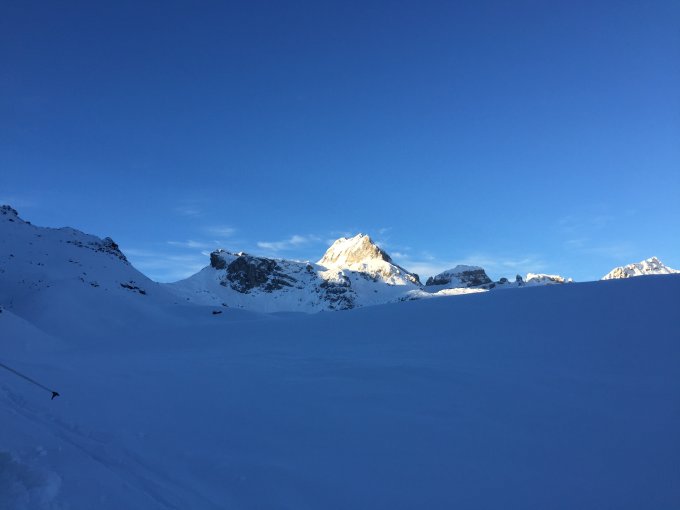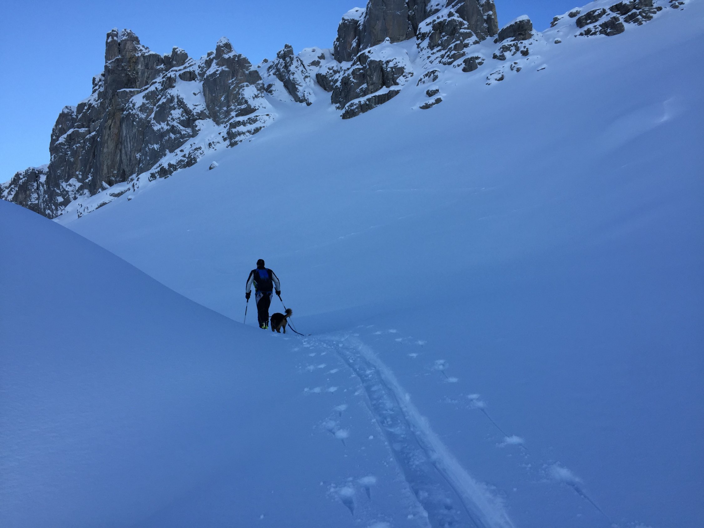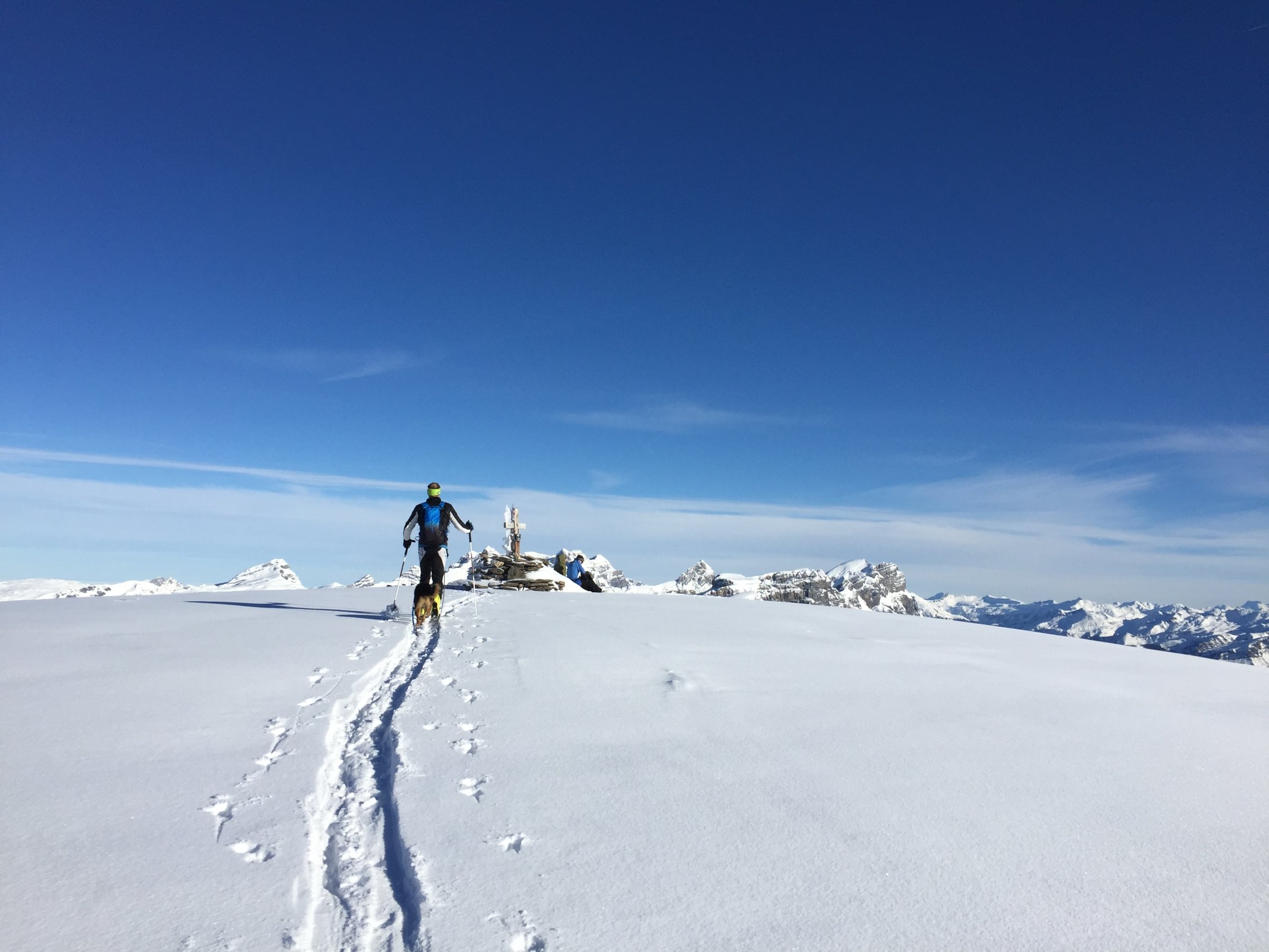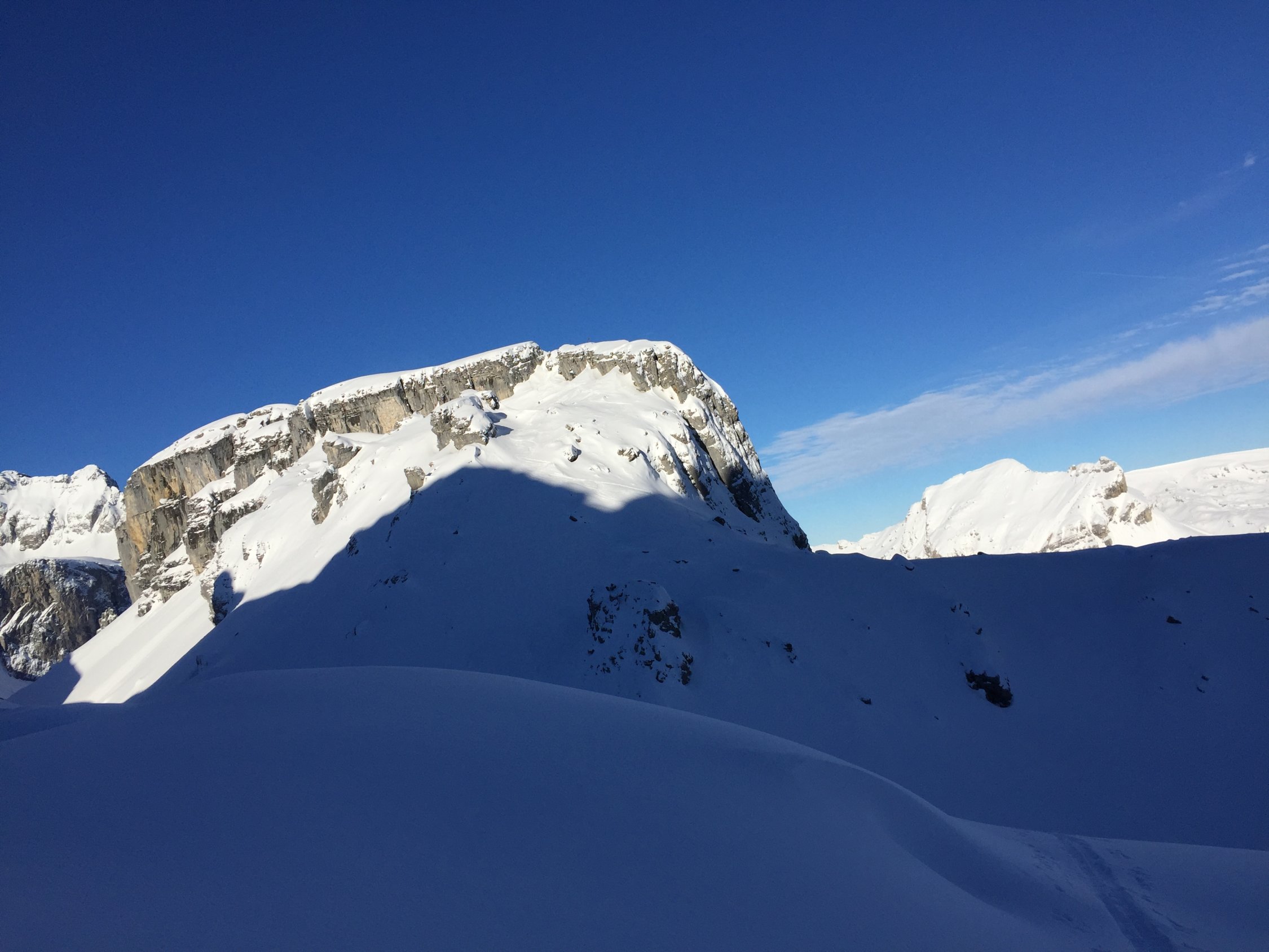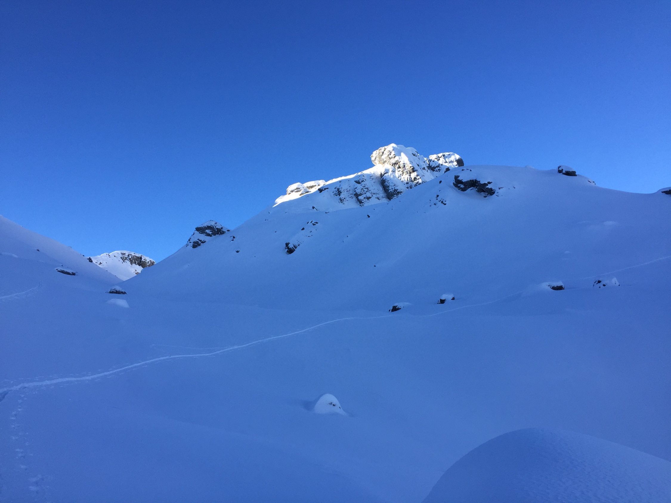 Unten beim Start sowie durch den Wald sehr wenig Schnee, Aufstiegsspur eher eisig und offenbar hat es draufgeregnet. Ab ca. 1500 zunehmend gute Verhältnisse mit POW auf hartgefrorener Unterlage.