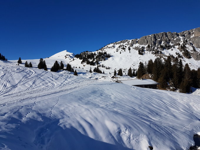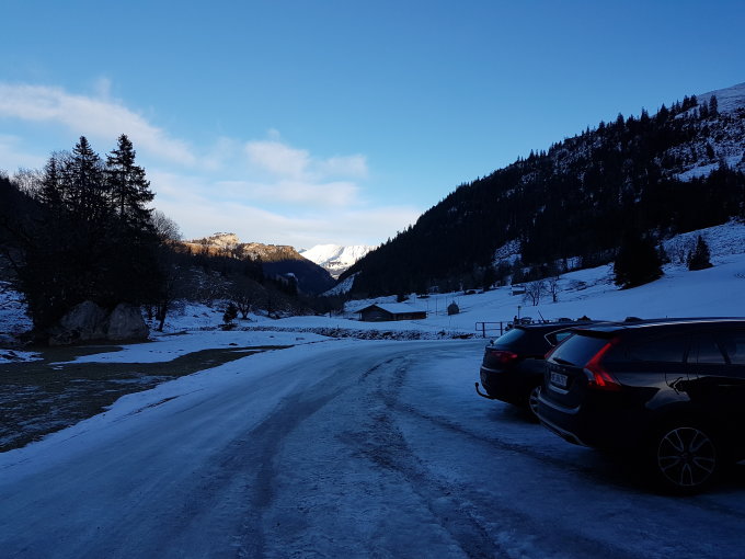 Die Strasse unterhalb des Brätliplatzes hat eisige Stellen (Schlittschuhlaufen wäre wohl möglich..). Kurze Stücke sind nur 4 Skibreiten Eis und daneben ausgeapert.