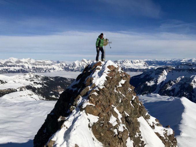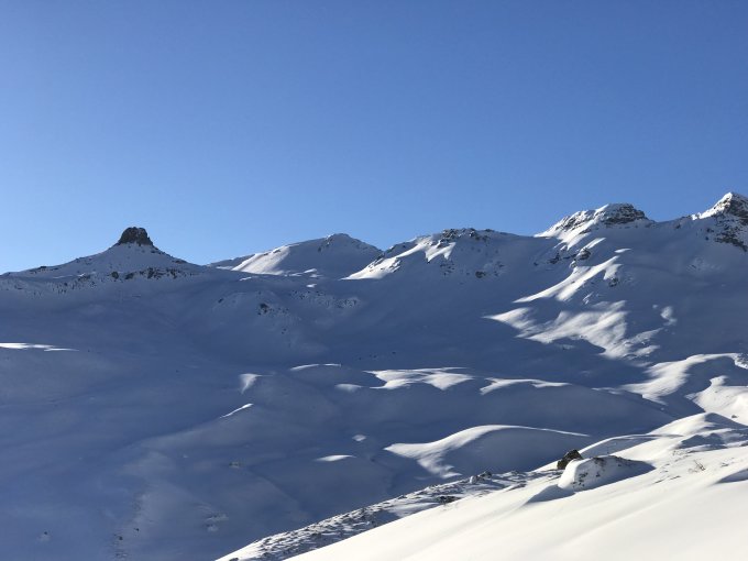 Wunderschöner Tag, frischer Pulver auf altem Deckel, zum Teil abgeblasen, Triebschneeansammlungen usw., zum Teil auch eisig gefroren (vom vormaligen Regen?), am Kamm starker Wind, Rinne auf den Spitzmeilen perfekt eingeschneit, sehr schön zu gehen, Abfahrt na ja.