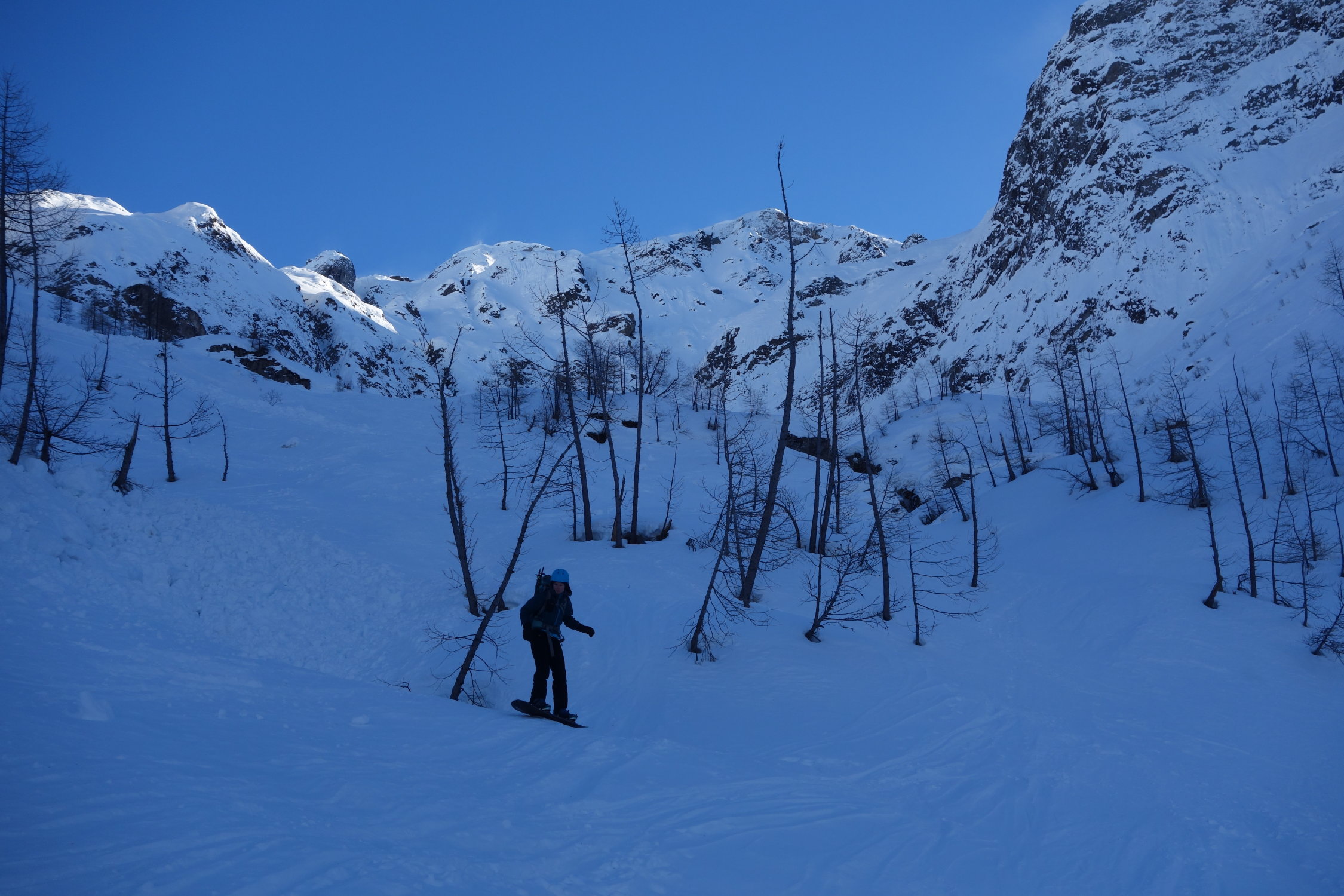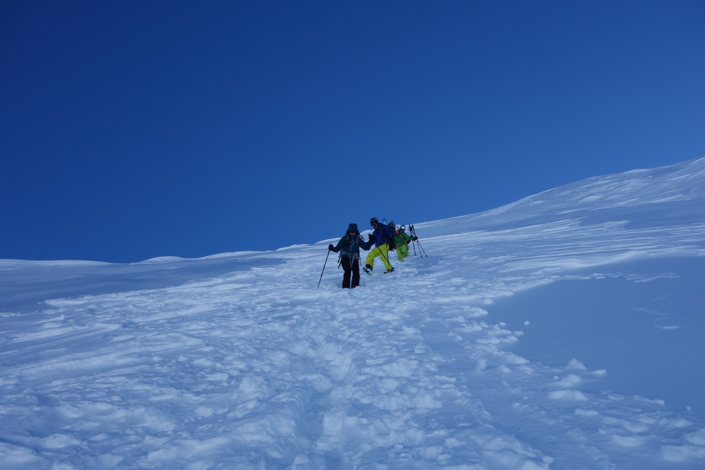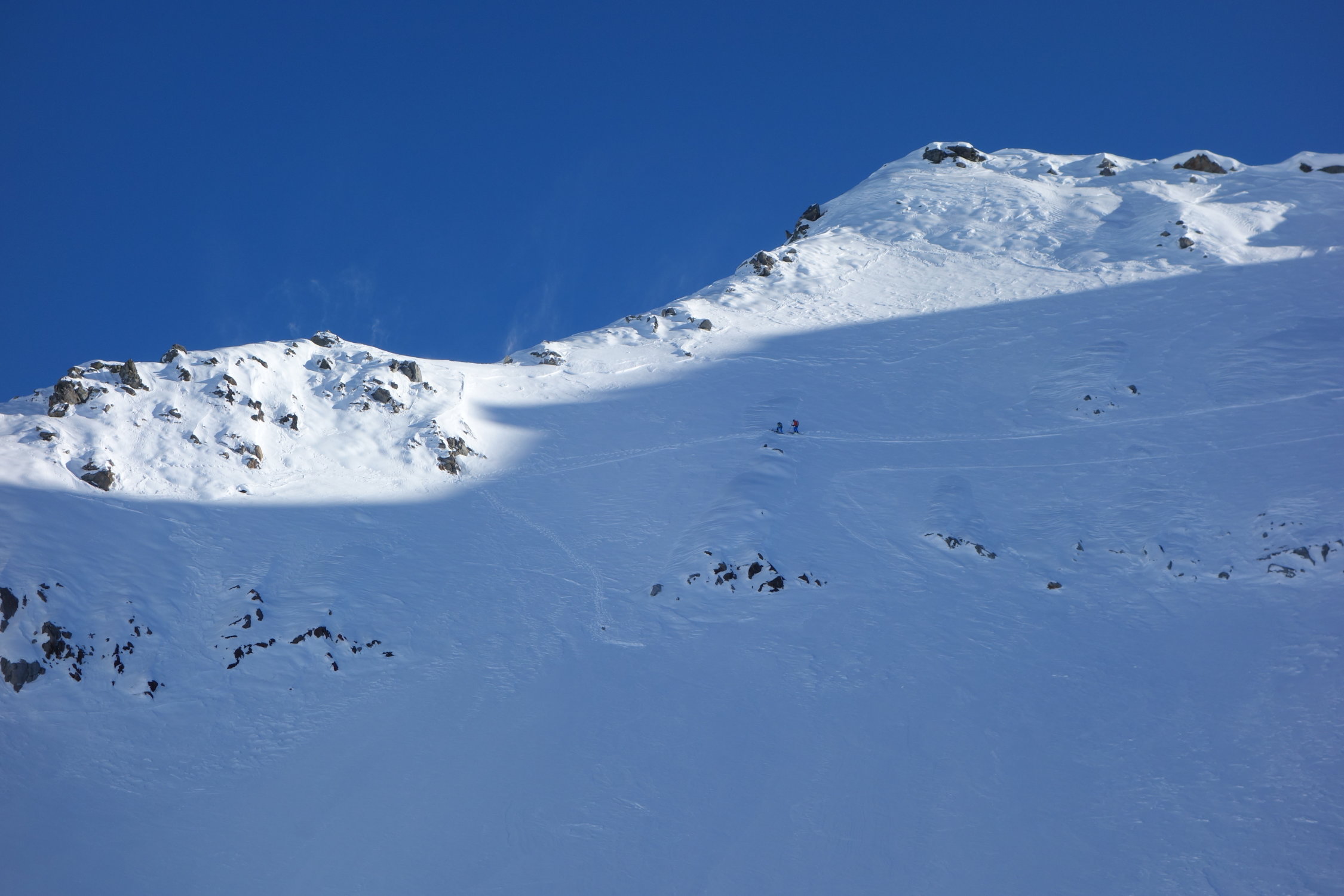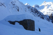 Aufstieg auf sehr hartgepressten Schnee - Spur teilweise nicht mehr vorhanden, im oberen Teil eisüberzogene Passagen. Daher für Splitboarder Harscheisen obligatorisch. Die letzten 50hm ist keine Spur mehr vorhanden und man steigt zu Fuss in tiefen Tritten auf, Stöcke genügen. Auf den Abfahrtsgenuss muss man derzeit verzichten. Auch zum Lago di Naret ist die Flanke stark abgeblasen.