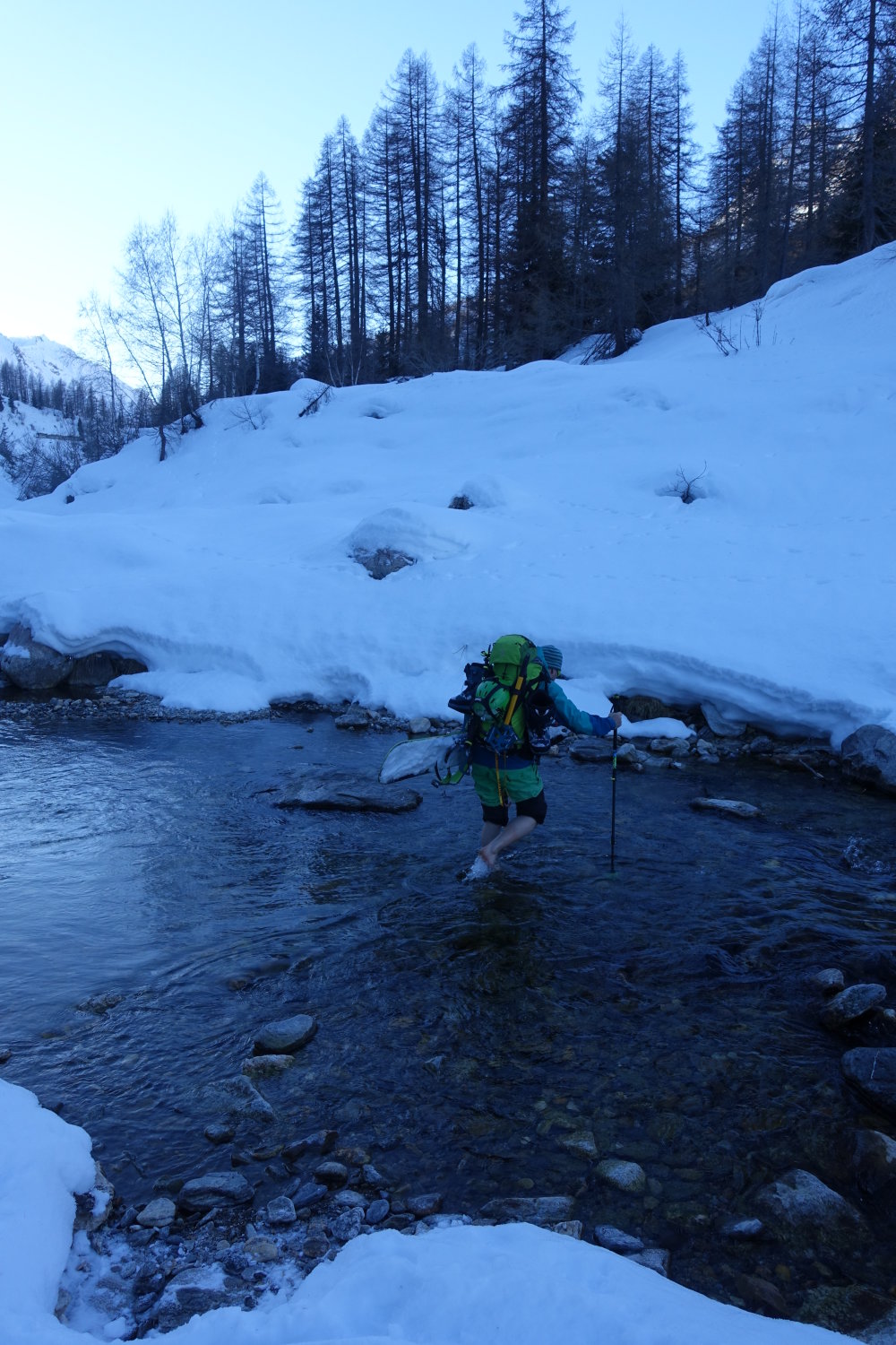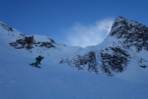 Eigentlicher Plan war die Abfahrt durchs Val Piana. Aufgrund des starken Windes sparten wir uns den Wiederanstieg nach dem Passo Cima die Lago und wählten die Abfahrt entlang des Ri die Valleggia. Der Gully ist zwar steil 35-40°, aber mit griffigen Schnee dick eingepackt und es führt eine gute Spur bis nach Ronco. Wem die Brücke zu weit weg ist, kann wie wir eine erfrischendere Direktlösung über die Ticino nehmen…Wasserstand niedrig.=)