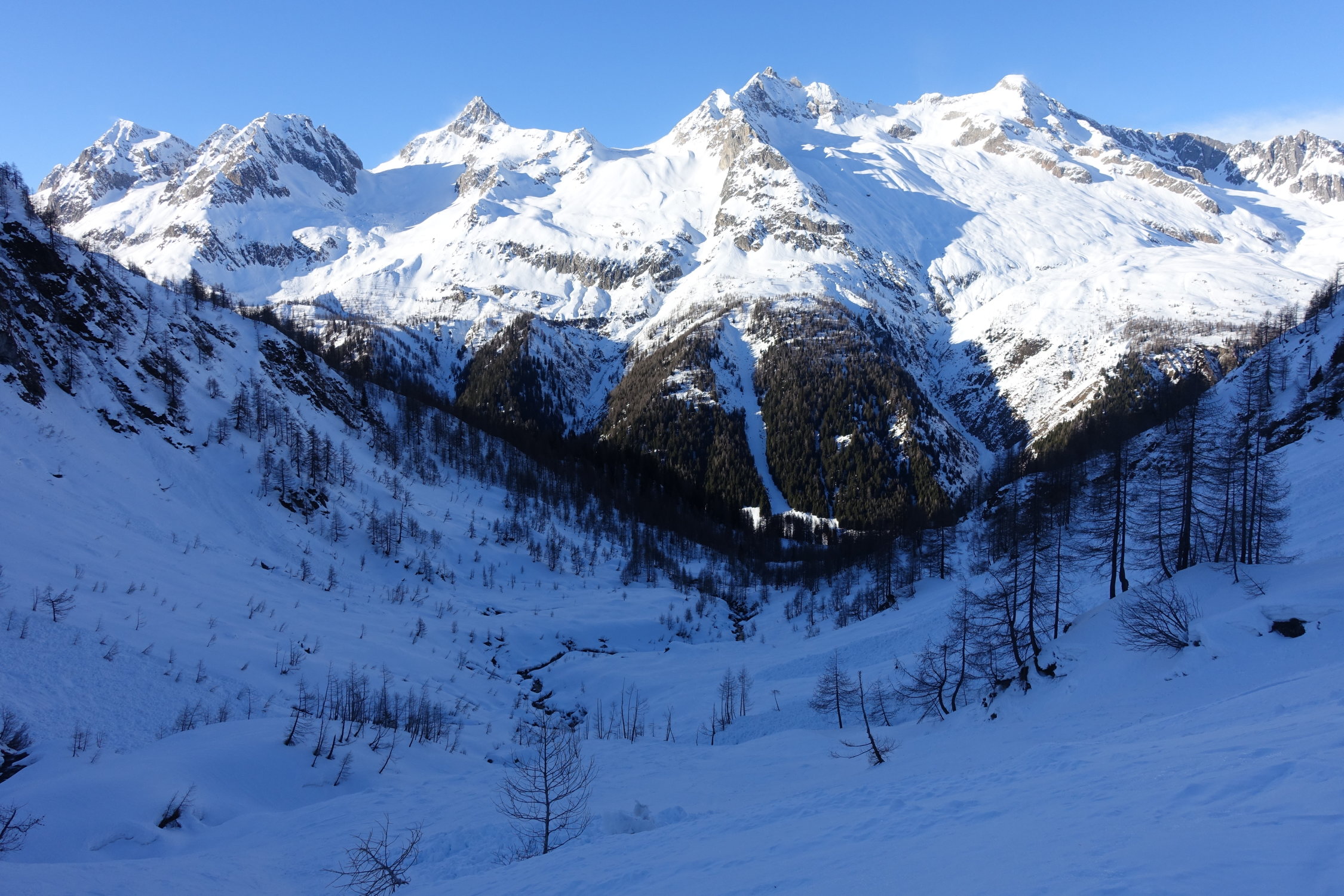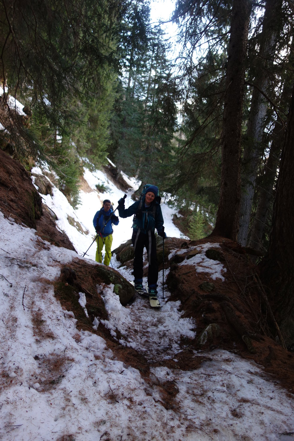 Aufstieg am Sylvesterabend zur Cap. Cristallina von Osassco aus. Im Wald ist die Spur schon sehr abgelutscht und manche Felsstufen sind blank - für Abfahrt ungeeignet.