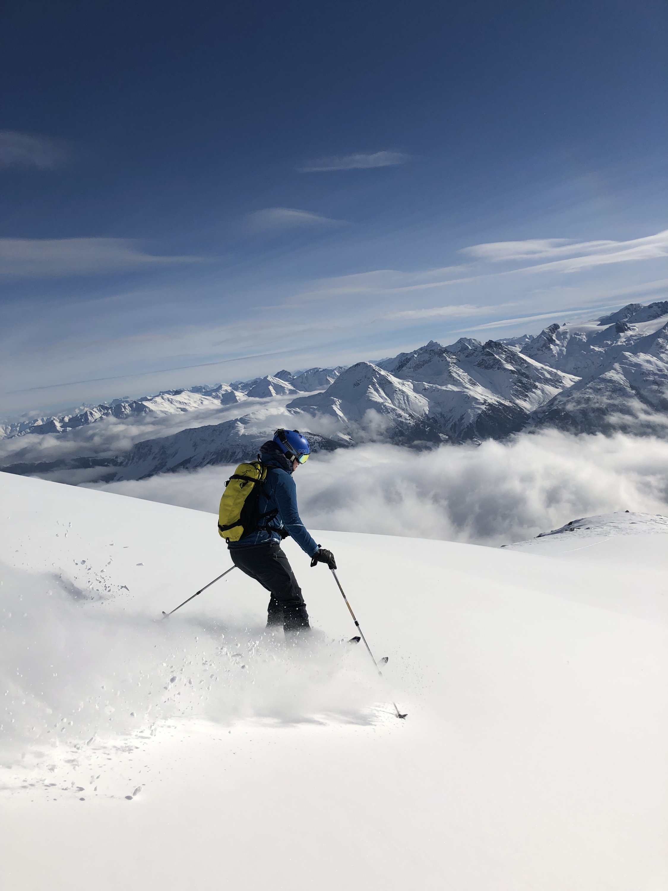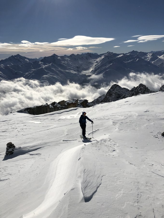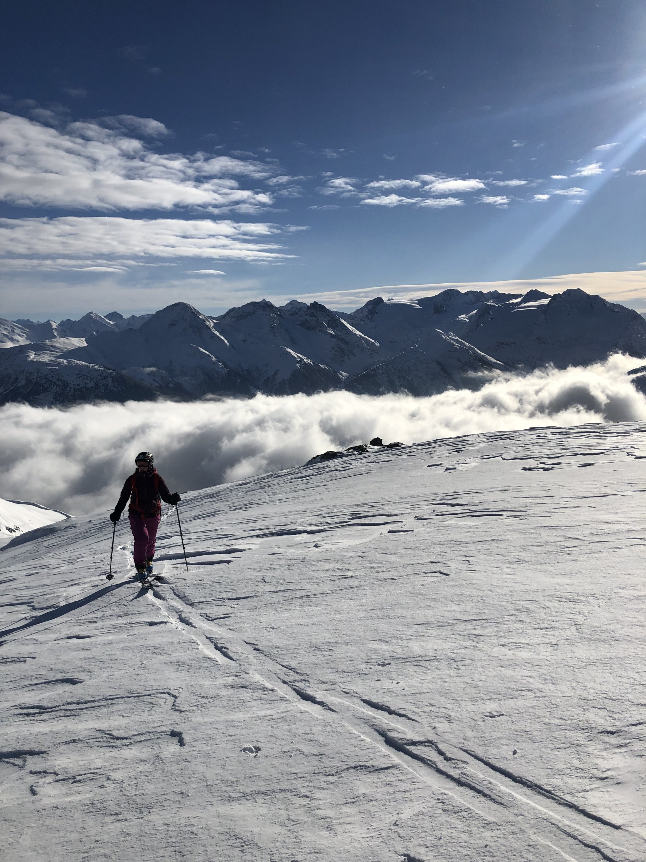 Neues Spur angelegt, noch oben keine Probleme, Seil vom Felspassage freigegraben. Rückweg super Pulver