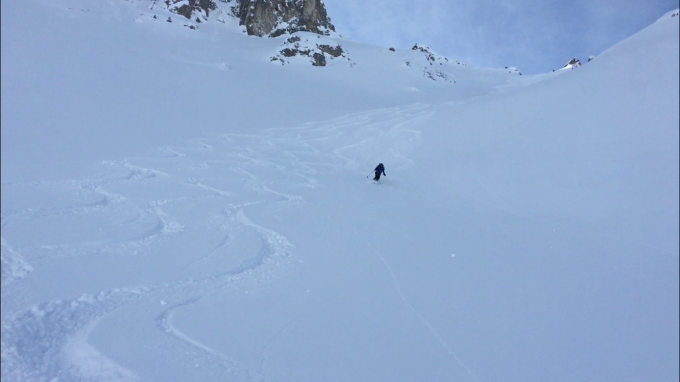 Nach dem üppigen Schneefall die letzten beiden Tage heute perfekte Verhältnisse. Ca. 30 cm Pulverschnee auf tragender Unterlage, nur oben entlang des Kamms zum Teil heftig vom Wind gezeichnet. Den Gipfel haben wir daher zugunsten einer besseren Startnummer für die Abfahrt ausgelassen ;-). Abfahrt direkt nach Norden in die Rinne westlich des Felsaufbaus heute perfekt.