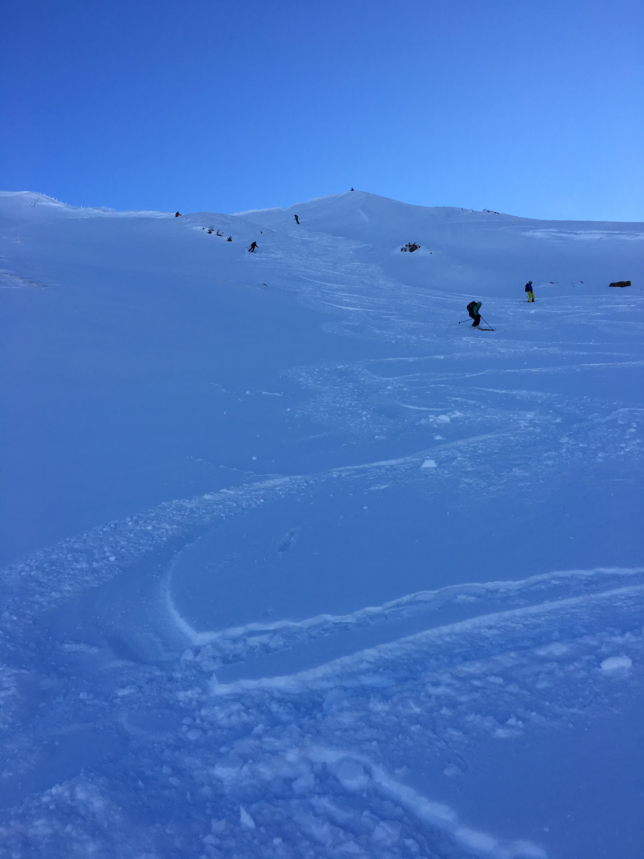 Ganze Tour mit Ski machbar. Schnee im unteren Teil wenig aber harte Unterlage. Ab 1700 dann gut. Weg fahrbar. Auf der Strasse 2 Stellen wo die Skis abgezogen werden müssen. Im Nordhang noch Platz für eigene Schwünge gehabt im Pulver. Sonst verfahren. Gipfelgrst mit genug Schnee.