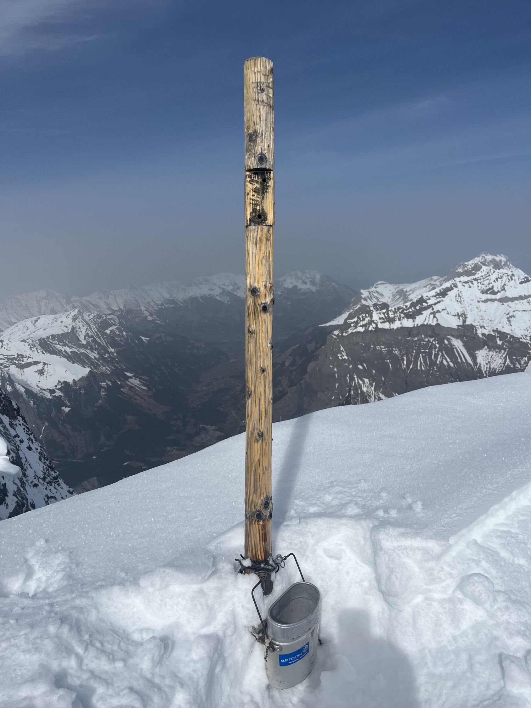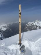 Das Kreuz ist defekt und bei der Gamelle fehlt der Deckel. Entsprechend ist das Gipfelbuch zu einem harten Block gefroren. Ich versuche es wieder herzurichten und bringe es gelegentlich mit einem neuen Behälter zurück.