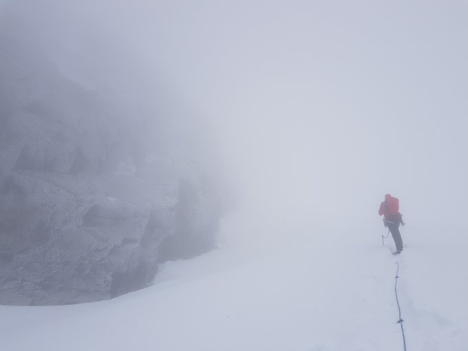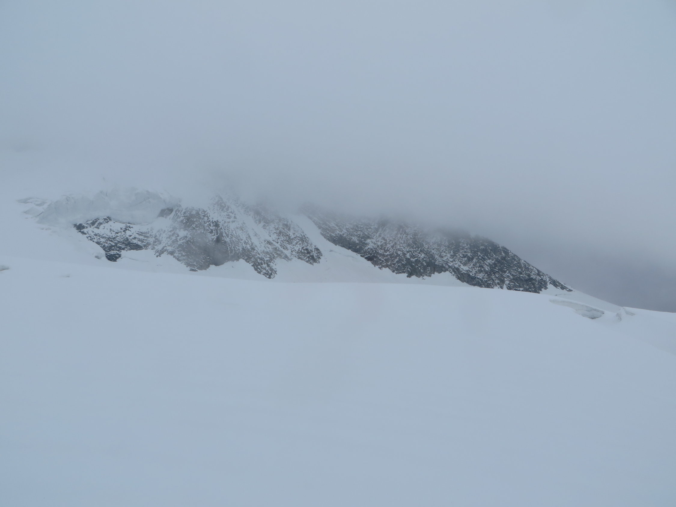 Weg ab Hütte schneefrei, Abstieg zum Gletscher im Firn. Auf dem noch dick eingeschneiten Gletscher ging es mit mässiger Sicht ohne nennenswerte Spalten auf gleichmässig ansteigendem Weg zur Scharte.