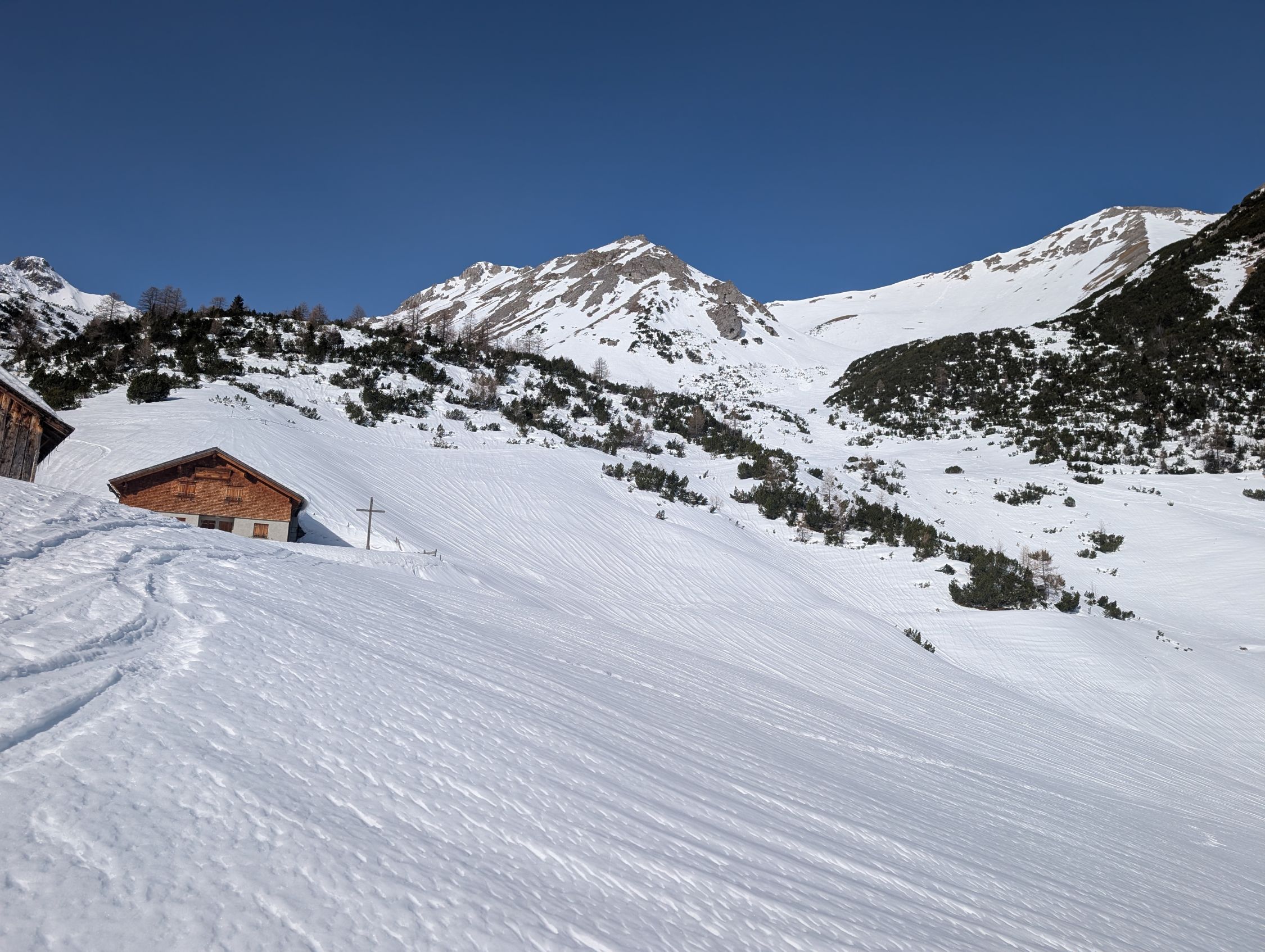 Ausgezeichnete Firntour, noch kaum Spuren. Südseitig ab ca 10:00 Uhr Firn, Abfahrt kurz nach 11:00 Uhr ideal. Nicht sonnenbeschienene Hänge und Ebenen auch noch in den Mittagsstunden hart (trangend, kein Deckel)