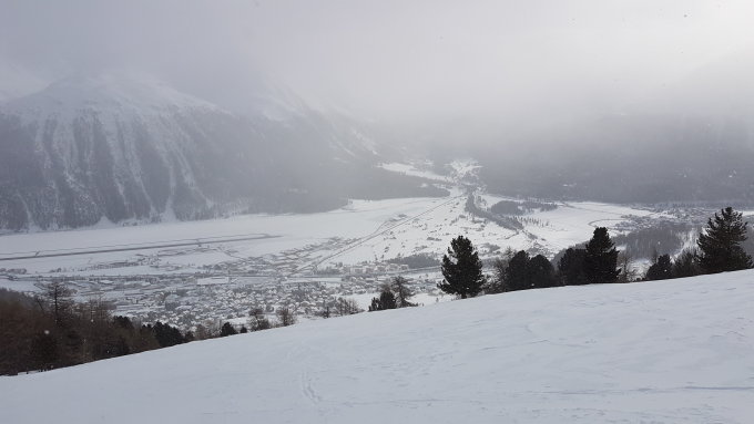 Abfahrt: Ganz oben hart vom Winde verweht. Je weiter man nach unten kam, fand man immer mehr schönen Schnee bis zu herrlichem Pulver. Biin zwischen Alp Munt und Alp Muntatsch runter gefahren, auf dem erlaubten Weg in der Wildruhezone. Fast zuunterst auf dem Weg liegt immer noch eine umgefallene Tanne.