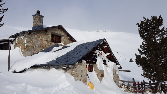 Bin in den letzten 4 Tagen dreimal auf den Cho gegangen. Zweimal mit den Skiern, einmal mit den Schneeschuhen. Oberhalb der Waldgrenze immer stürmische Winde und entsprechend verblasenes Terrain.