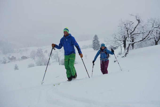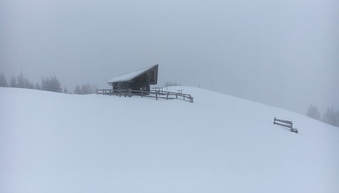 Der Neuschnee, ca. 30cm, fiel auf keine oder nur eine dünne Unterlage. Das Gebiet besteht jedoch hauptsächlich aus Wiesen, wobei sich einzelne „Feinde“ durchaus auch bemerkbar machen können. Schnee vom Start weg.