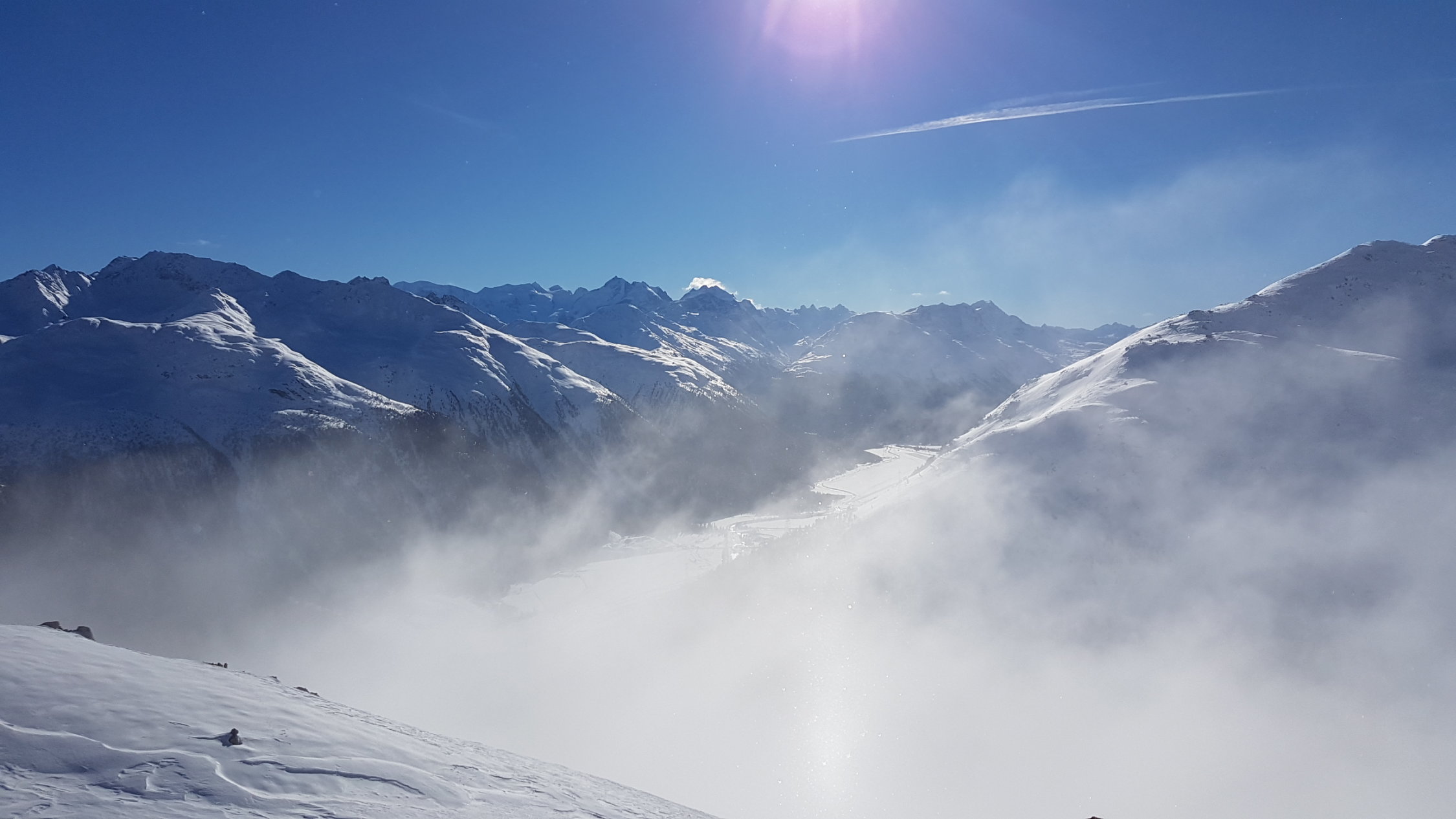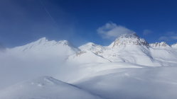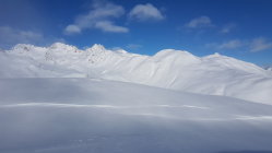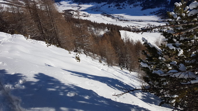 Bin im Aufstieg im Gebiet Bursella links über die Brücke abgezweigt und einer bereits vorhandenen Spur gefolgt. Dabei musste man die Wildruhezone links vom Bach im Gebiet Sur Chastè beachten. Da an mehreren Stellen Wasser runter kam war nicht ganz klar, wo der Bach wirklich runter kam. Bin deshalb von der Spur abgewichen und habe mich etwas mehr rechts gehalten. Wie ich nun auf der Karte sehe, wäre doch noch etwas Spielraum nach links gewesen. Gelände ist ziemlich steil, mit dem vorhandenen Schnee ging es trotzdem ganz gut. Auf der Höhe vom ca. 2060m bin ich dann in die normale Aufstiegsroute gekommen. Über der Waldgrenze wie gewohnt zum Teil stark abgeblasen. Trotzdem gut vorwärts gekommen im Aufstieg.