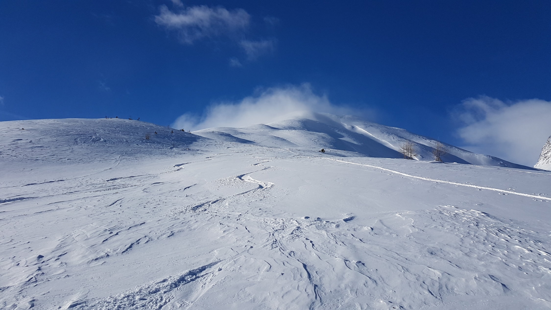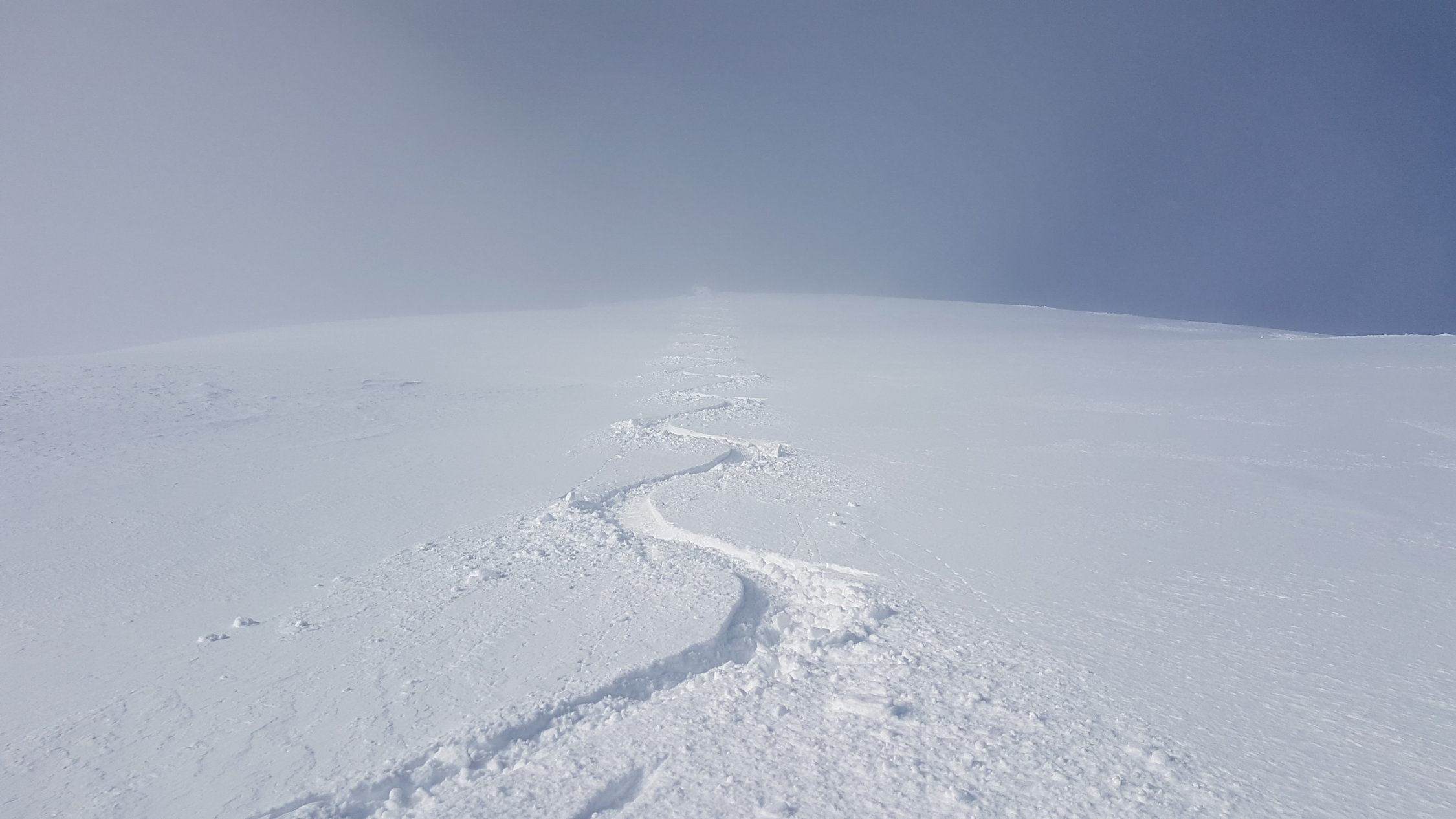 Abfahrt mehr oder weniger der Aufstiegsspur nach runter. Oben musste man den gut fahrbaren Schnee etwas suchen.