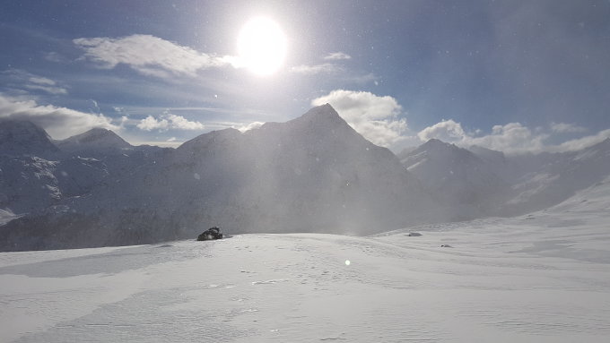 Mit leichtem Nordwind kurz vor 9 Uhr in Plaun da Lej gestartet. Bei Grevasalvas links gehalten und den Hang östlich von Lavatera hoch. Bereits unterhalb von Grevasalvas hat der Wind merklich zugenommen. Bei Plaun Grand nach links gehalten am Muotta Rodonda vorbei und den etwas weiniger steilen Hang hoch. Westlich am Lej Nair vorbei zur Normalroute.Zum Teil sehr tiefer Neuschnee, vielen Dank an meinen super Spurmann. Im obersten Teil auch wieder südlich von der Normalroute auf den Gipfel. Der stürmische Wind hatte nur einen kurzen Gipfelhalt zur Folge.